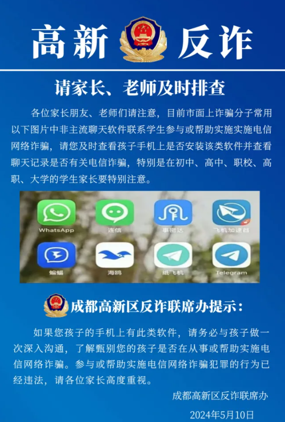 5月10日,据成都高新公安消息:近期,成都高新公安分局反诈中心发布紧急提醒:请家长、老师及时检查孩子的手机是否安装有“连信”“蝙蝠”“事密达”“海鸥”“纸飞机”等非主流社交软件。