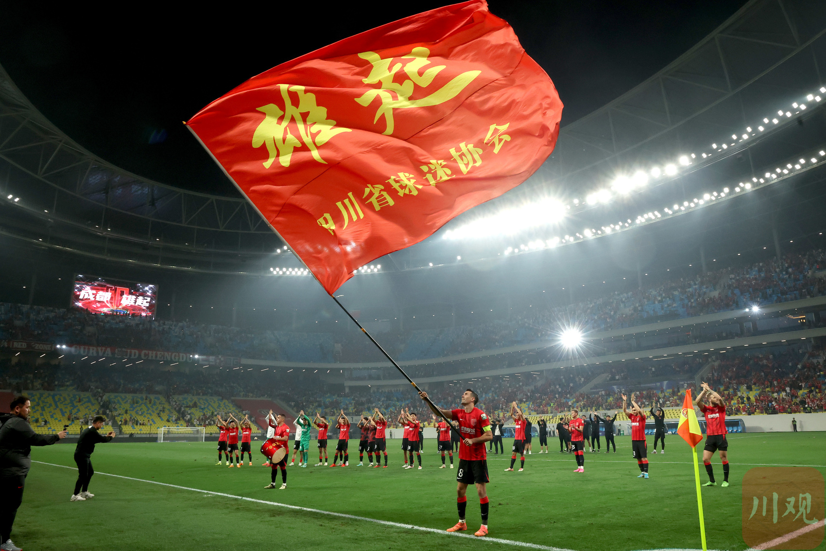 赛后,成都蓉城队长周定洋挥舞“雄起”大旗与队员一起庆祝比赛胜利