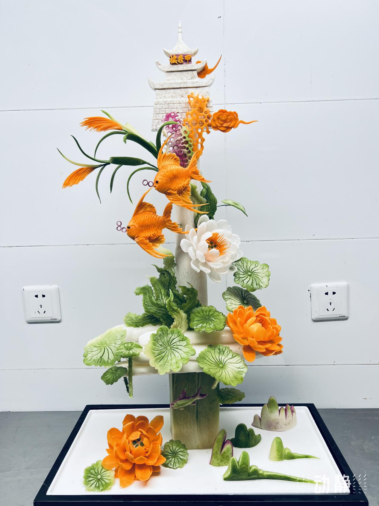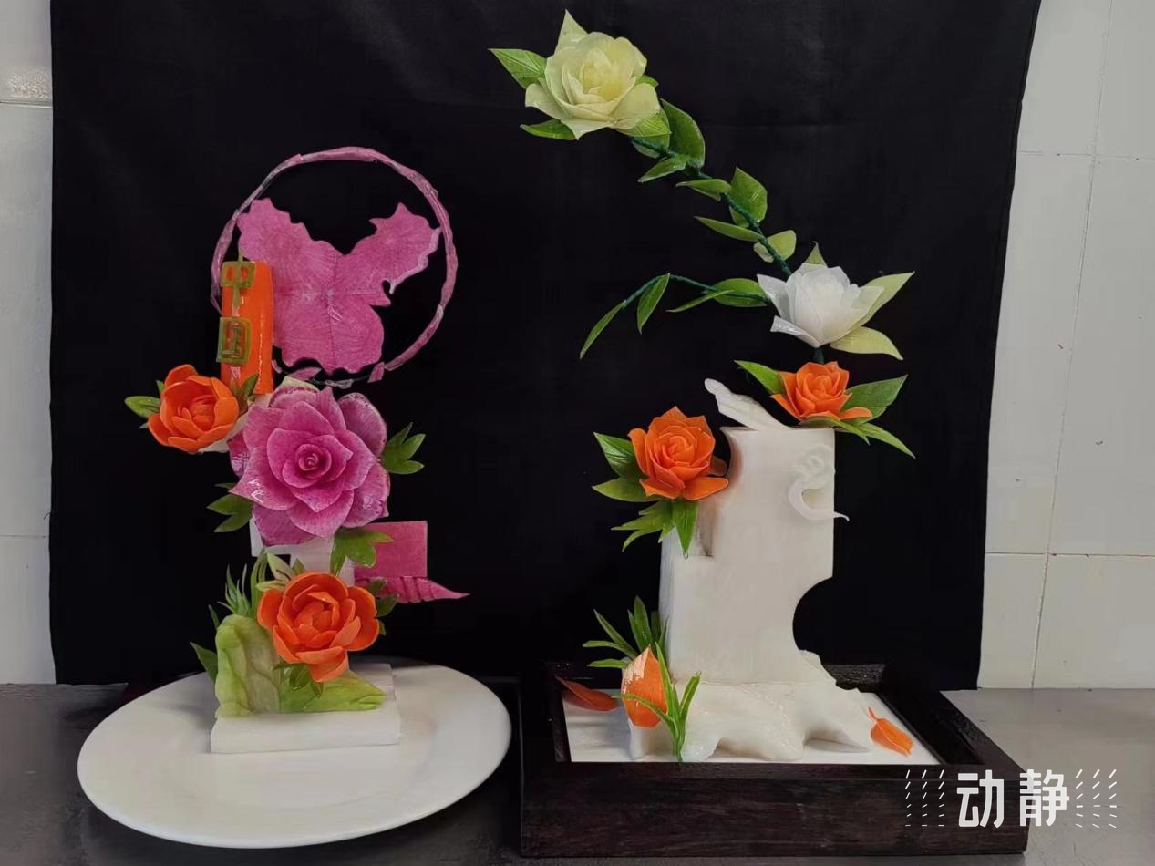 康进的“没想到”,从他双手布满的大小伤痕,不难找到答案。指着手上一条被雕刻刀割到血管的刀疤,康进谈起了自己那些“挑灯”苦练的日子。“为了练好食材雕刻,我常常去菜场买萝卜和面粉在宿舍练习,萝卜用来练习雕花,面粉揉成团后雕不同的动物。因为学校每天都要统一关灯,我就打着手电筒练,灯不够亮,雕刻刀划破手指是家常便饭。”