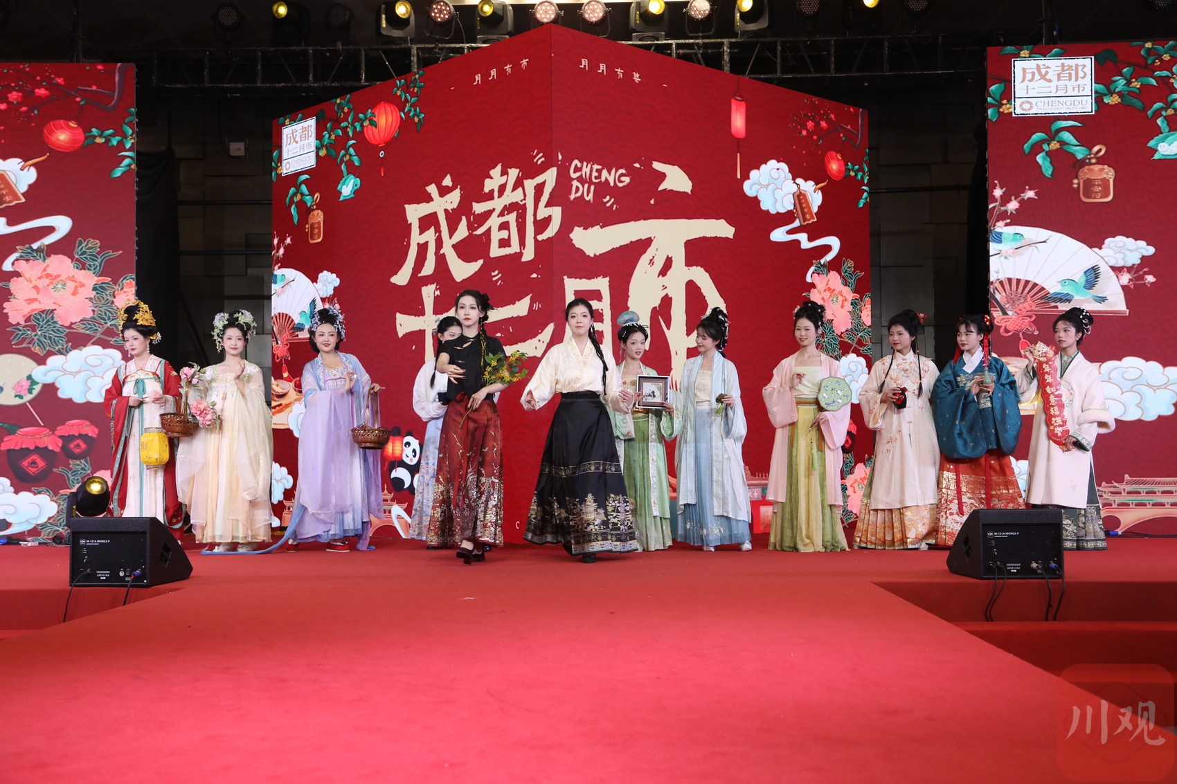成都自古因商而立、因商而兴,唐宋时期形成了官方主导按月令举办的专业性市集“十二月市”。成都在推进国际消费中心城市建设中,焕新开展新“十二月市”促消费活动,将新“十二月市”打造为成都特色消费品牌。在《“十二月市”》演出中,模特身着成都汉服品牌“重回汉唐”,以走秀方式演绎正月灯市、二月花市、三月蚕市、四月锦市、五月扇市、六月香市、七月宝市、八月桂市、九月药市、十月酒市、十一月梅市、十二月福市等“十二月市”月令内涵,展现成都形象、助力提升消费热度。