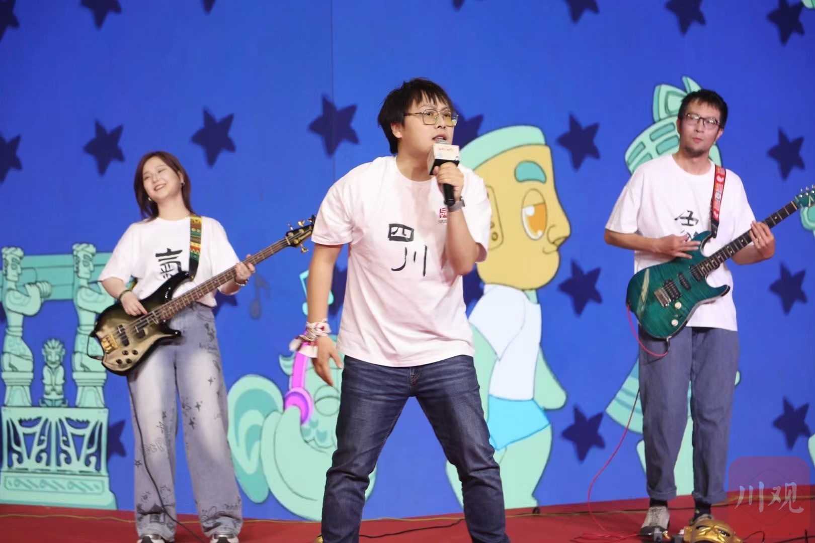三星堆遗址新一轮考古发掘,让沉睡三千年的古蜀文明“再醒惊天下”。伴随着国宝文物上新,四川日报·川观新闻、四川省文物考古研究院、三星堆博物馆联合推出的《我怎么这么好看(三星堆文物版)》《门没锁(三星堆文物版)》等改编乐曲走红网络、斩获“亿级”流量。身着“气象万千品四川”字样服饰的堆堆乐队,把这两首“神曲”带进中国品牌日,用欢快旋律和火爆歌声传播三星堆文化品牌。