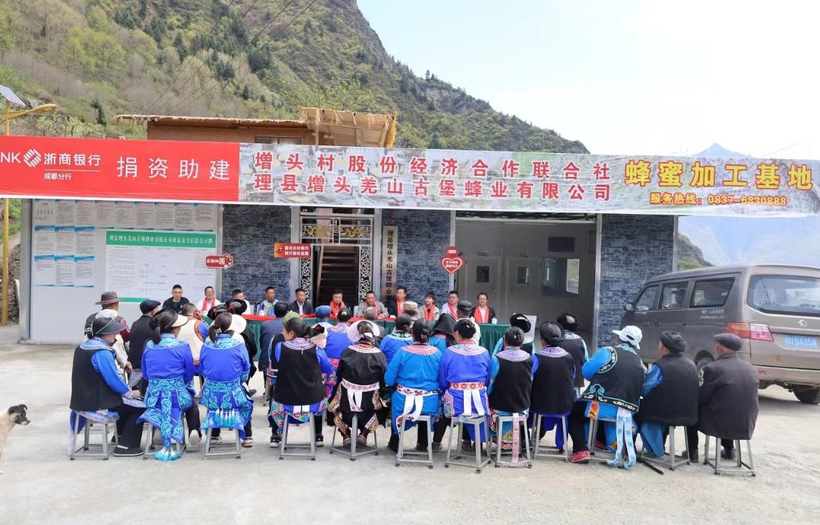 4月26日,浙商银行成都分行捐资助建的阿坝藏族羌族自治州理县增头村股份经济合作联合社蜂蜜加工基地举行扩建验收仪式,浙商银行成都分行行长王成、副行长吴敌等一行来到海拔3000多米的美丽羌寨,见证这一时刻,并实地走访调研推进帮扶工作。