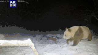 画面中棕色大熊猫先是被夜晚红外相机拍摄时的亮光吸引。在附近徘徊片刻后,又被相机近距离捕捉到它在雪地中悠闲踱步的景象。