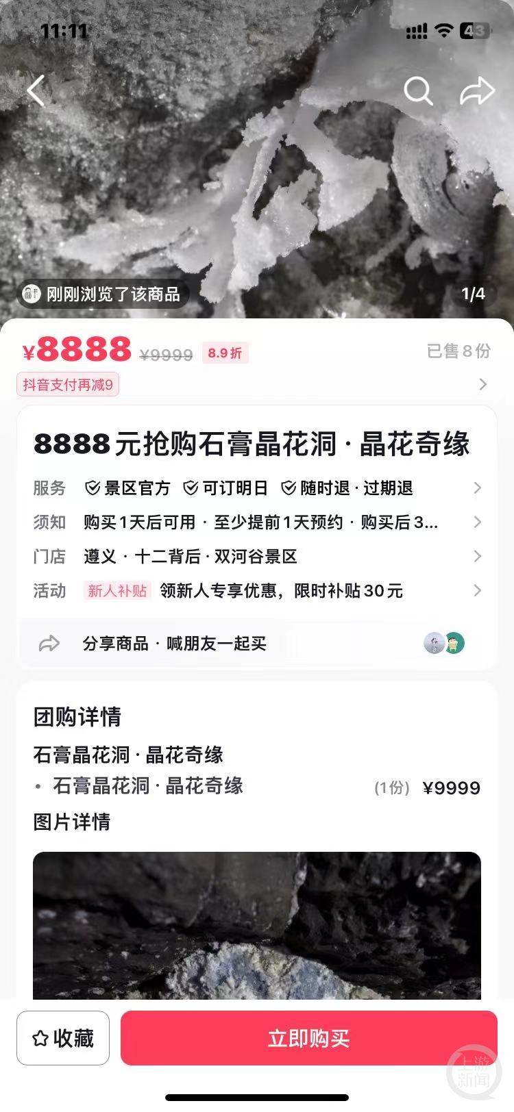 图片显示,该景点是贵州十二背后景区的石膏晶花洞。5月11日,上游新闻记者检索短视频平台,点开“十二背后”官方账号“本店团购”栏目看到,团购产品名称为“石膏晶花洞·晶花奇缘”,挂牌价9999元/份,打折后8888元/份,购买须知显示,产品需要提前1天电话预约,每份包含1名成人。截至目前已售8份。记者点击“购买”后,页面转至确认订单页面并载明:购买后30天有效。