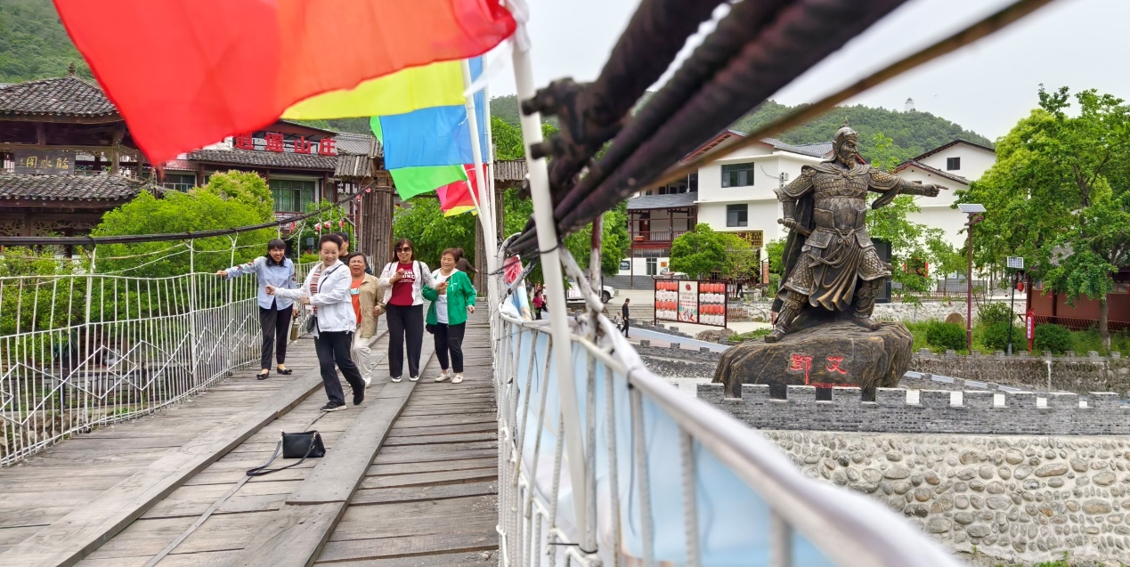 村口,吴正英笑看同伴们在古老的木质吊桥上拍短视频;河道下游,一条崭新的玻璃栈道正在等待验收。