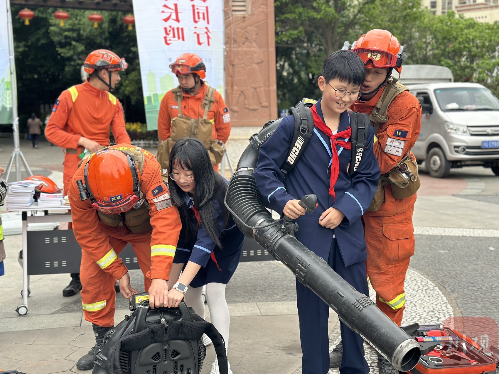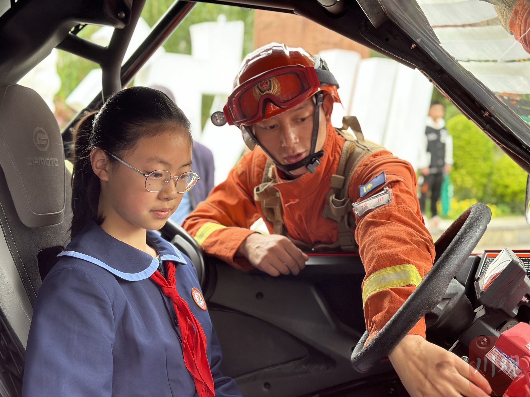 活动中,汶川县森林消防大队现场展示了森林防火艾克风力灭火机等装备,汶川消防救援大队的消防员现场演示了灭火器的使用方法,现场群众还积极参与,学习操作消防装备,提升了广大群众的安全意识和应急能力,营造了全民参与防灾减灾的浓厚氛围。汶川一小学生陈紫墨说,“消防员叔叔阿姨们给我讲解了很多防灾减灾的知识,我还亲身体验了全地形水泵车,让我学到在突发紧急情况是该怎么逃生和自救,我觉得参加这个活动很有意义。”