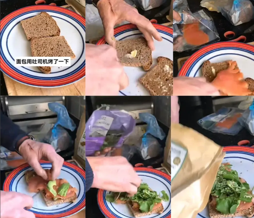 “干巴饭”是这样制作的:切两片面包,抹点黄油;接着,放两片鱼肉在面包上,再抓一把芝麻菜摆盘。这样,一顿“精致”的午餐就做好了。