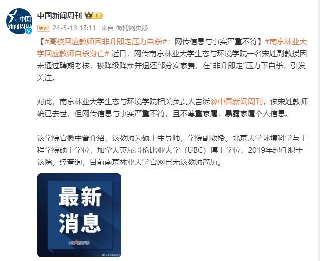 对此,南京林业大学生态与环境学院相关负责人告诉@中国新闻周刊,该宋姓教师确已去世,但网传信息与事实严重不符,且不尊重家属,暴露家属个人信息。