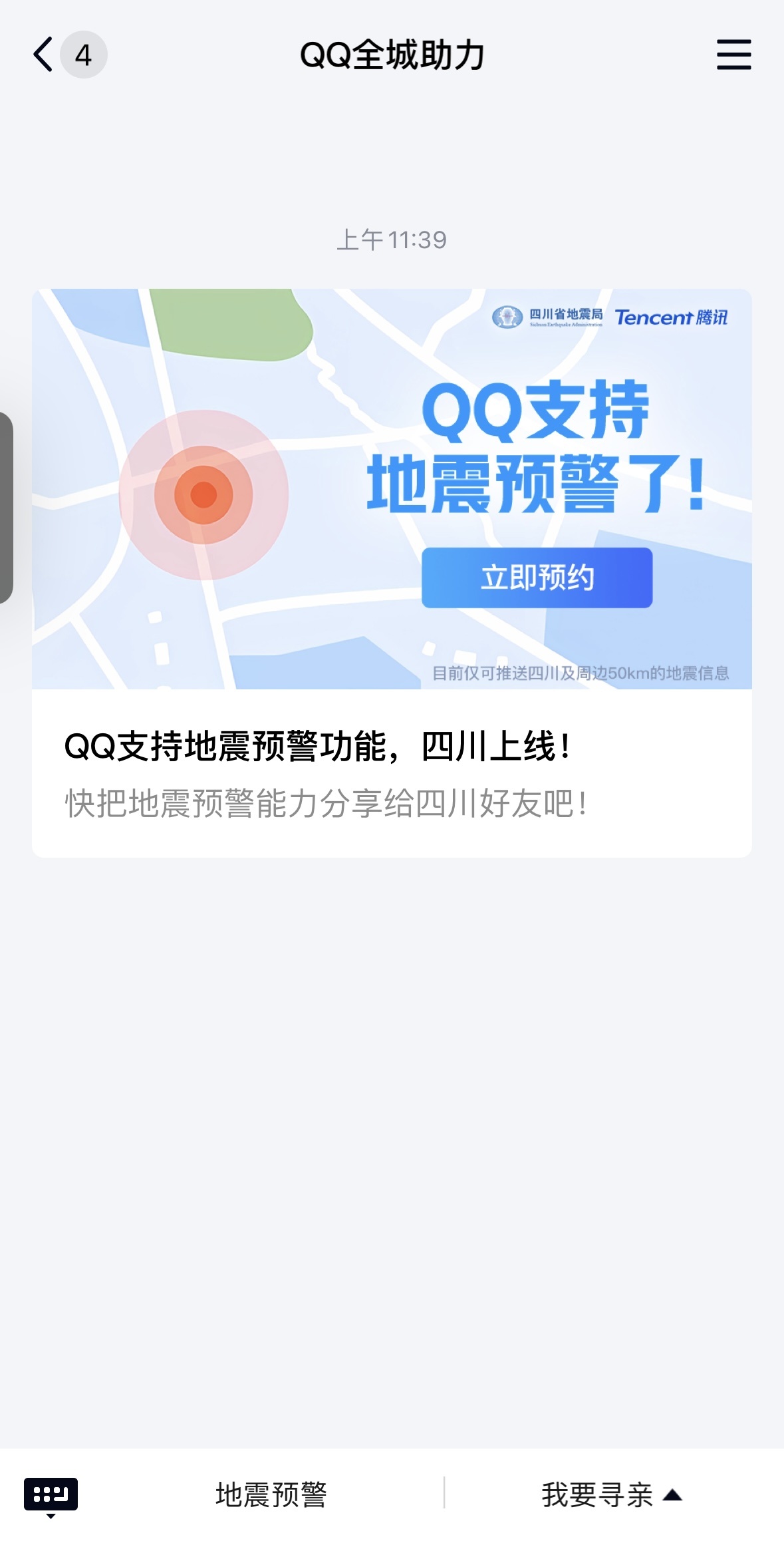 在QQ的地震预警服务中,可以最多设置两个想要收到地震预警的位置信息,并进行烈度范围设置,当前能够接收四川及周边50公里范围内发生的地震。四川省地震局工作人员介绍,用户通过手机QQ,搜索“QQ全城助力”选择“地震预警”,设置关注预警信息接收地区及地震烈度范围,即可完成QQ预警信息订阅;也可通过关注公众号或搜索小程序“四川地震台”,设置关注预警信息接收地区,完成微信预警信息订阅。完成订阅后,当地震发生时,官方地震预警信息将会快速精准触达用户,尽可能减少人员伤亡和财产损失。