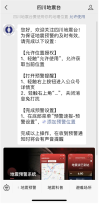5月13日,四川省地震局在QQ正式上线全省官方地震预警功能。同时,四川省微信地震预警平台“四川地震台”也在上线一周年之际完成功能优化升级,二期预警平台正式上线,接收预警步骤进一步简化,开启发生强震时推送锁屏通知的强提醒功能,并且增加高频音报警和避险指南。