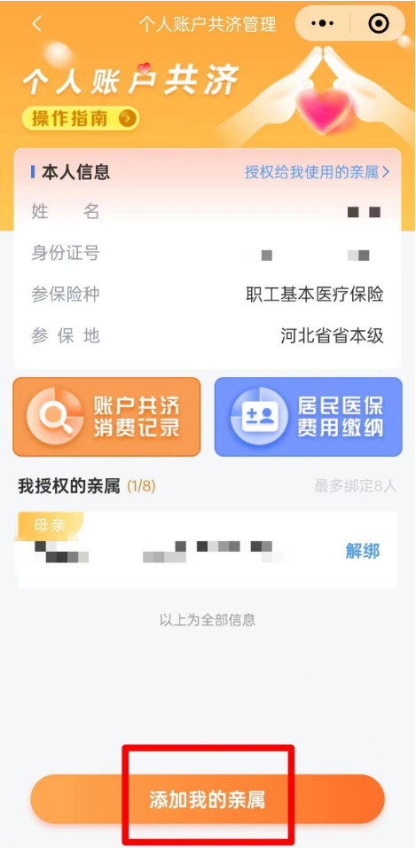 2、绑定亲属关系:职工参保人登录“河北智慧医保”小程序后,在业务办理栏目中进入“个人账户共济”功能,点击“添加我的亲属”按钮,进入绑定家庭成员信息填写页面。