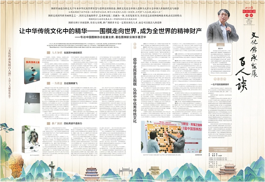 四川日报全媒体“文化传承发展百人谈”大型人文融媒报道持续推出,今日《四川日报》连版推出第三十三期,专访中国围棋协会名誉主席、著名围棋职业棋手聂卫平。