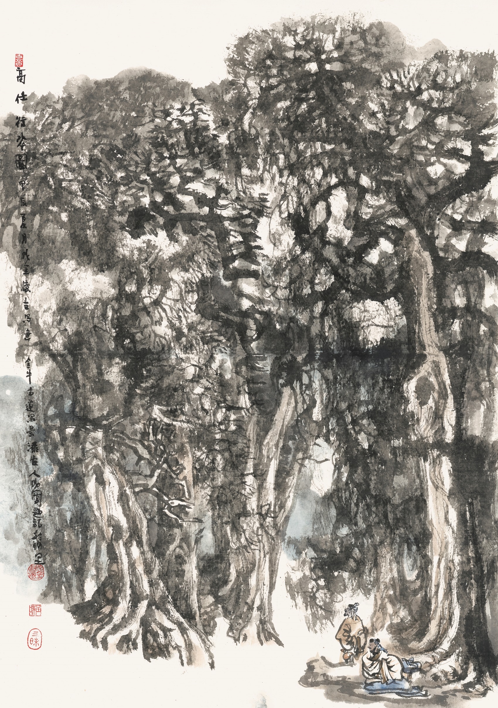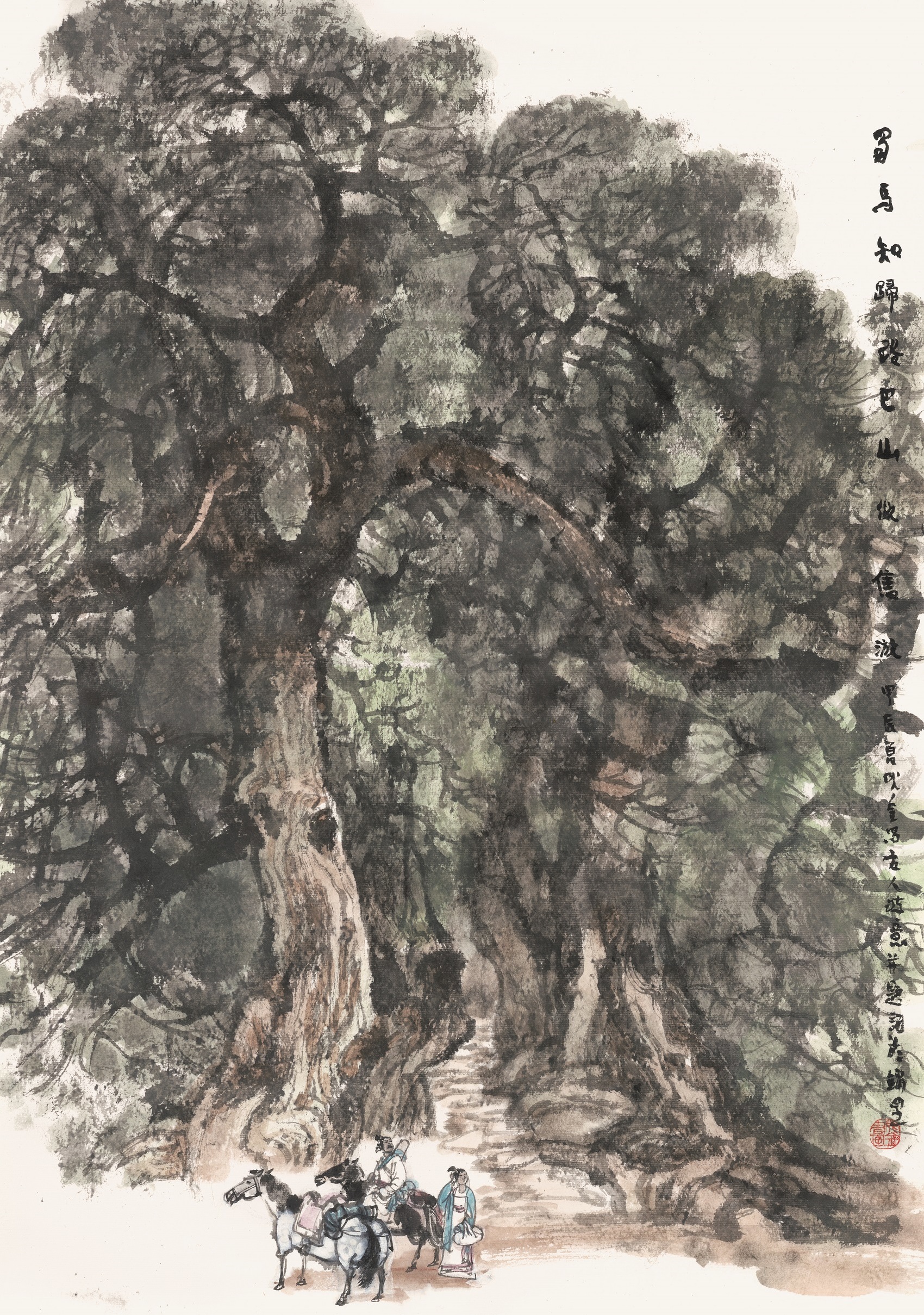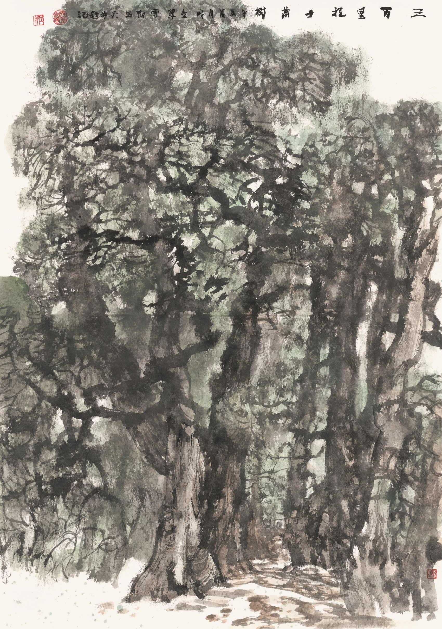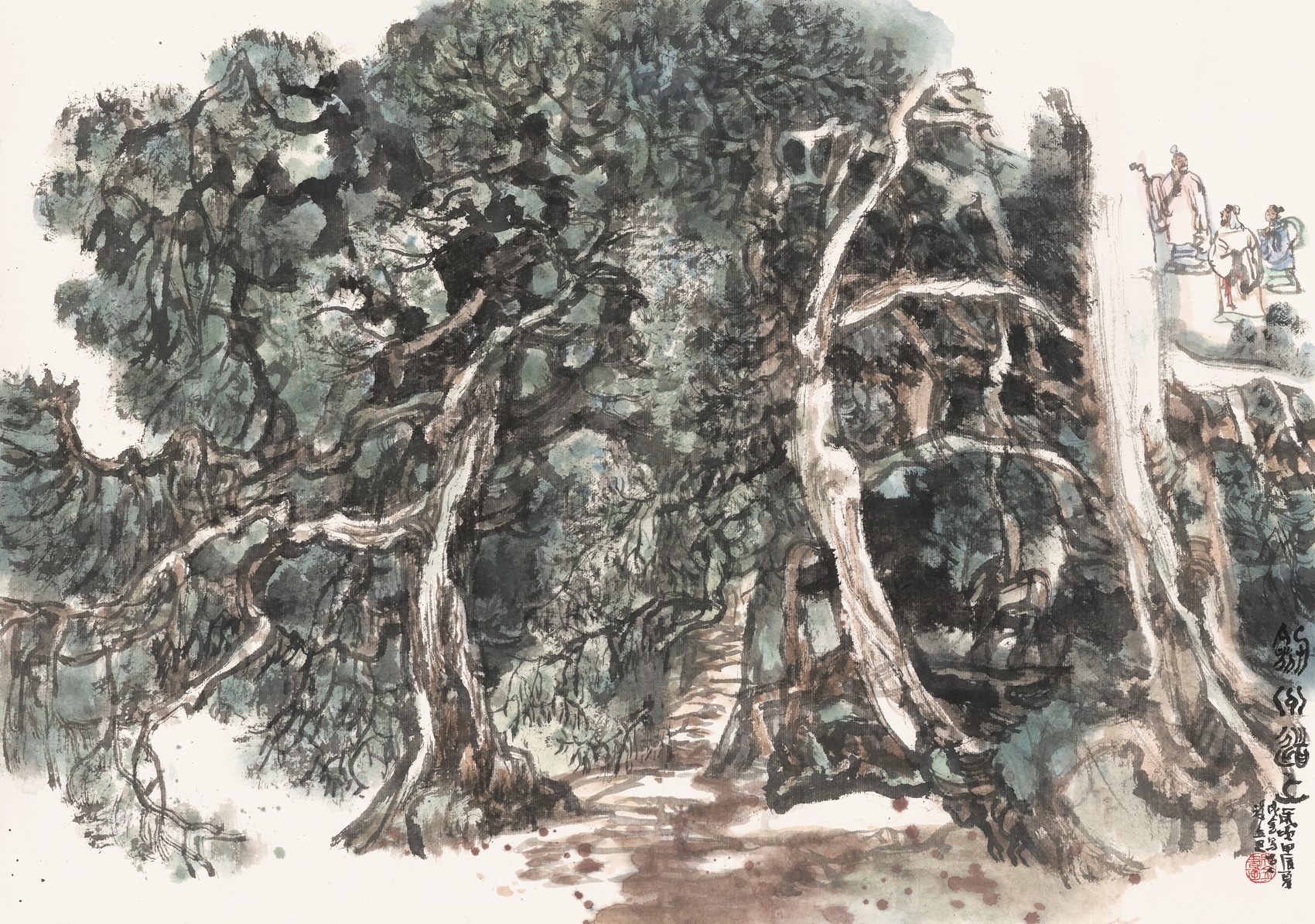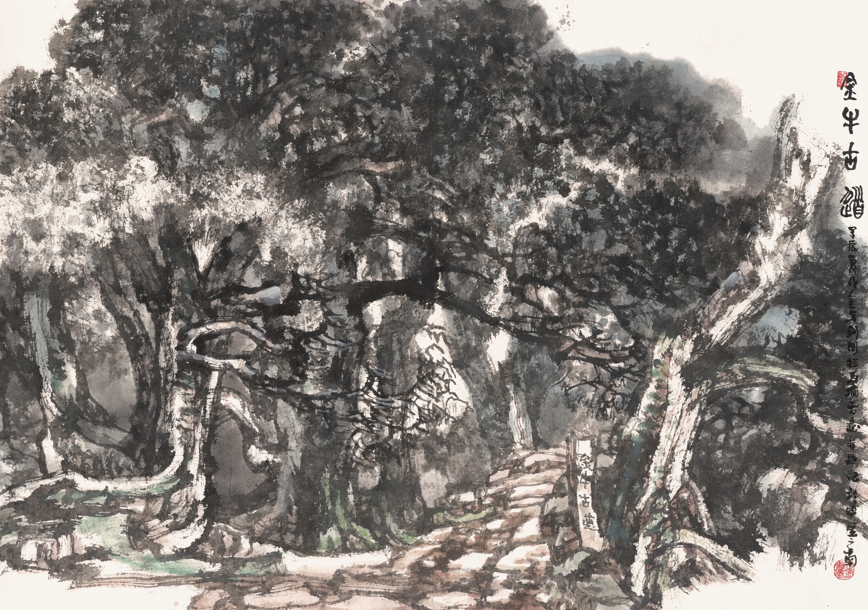 笔者之前曾去过翠云廊三次,第一次是大学时随巫成金去写生。每次去,我都会被震撼,都会在那千年的古木林道下流连往返,驻足仰望。那苍劲挺拔的古柏或直插蓝天,或如龙行江海。如盖的浓阴,遮天蔽日,行走其间,清幽静谧,纵是盛夏酷暑,也凉爽如秋。若有强风来袭,如闻惊涛,然林下却不见波澜。四季常青,千年一绿。立于其间,定有提笔一画的冲动,然而总是找不到它的密码。千年翠云廊,太厚重了,即使画出一两棵参天古木,也没触及翠云廊的皮毛,更别说写出翠云廊的情与魂。