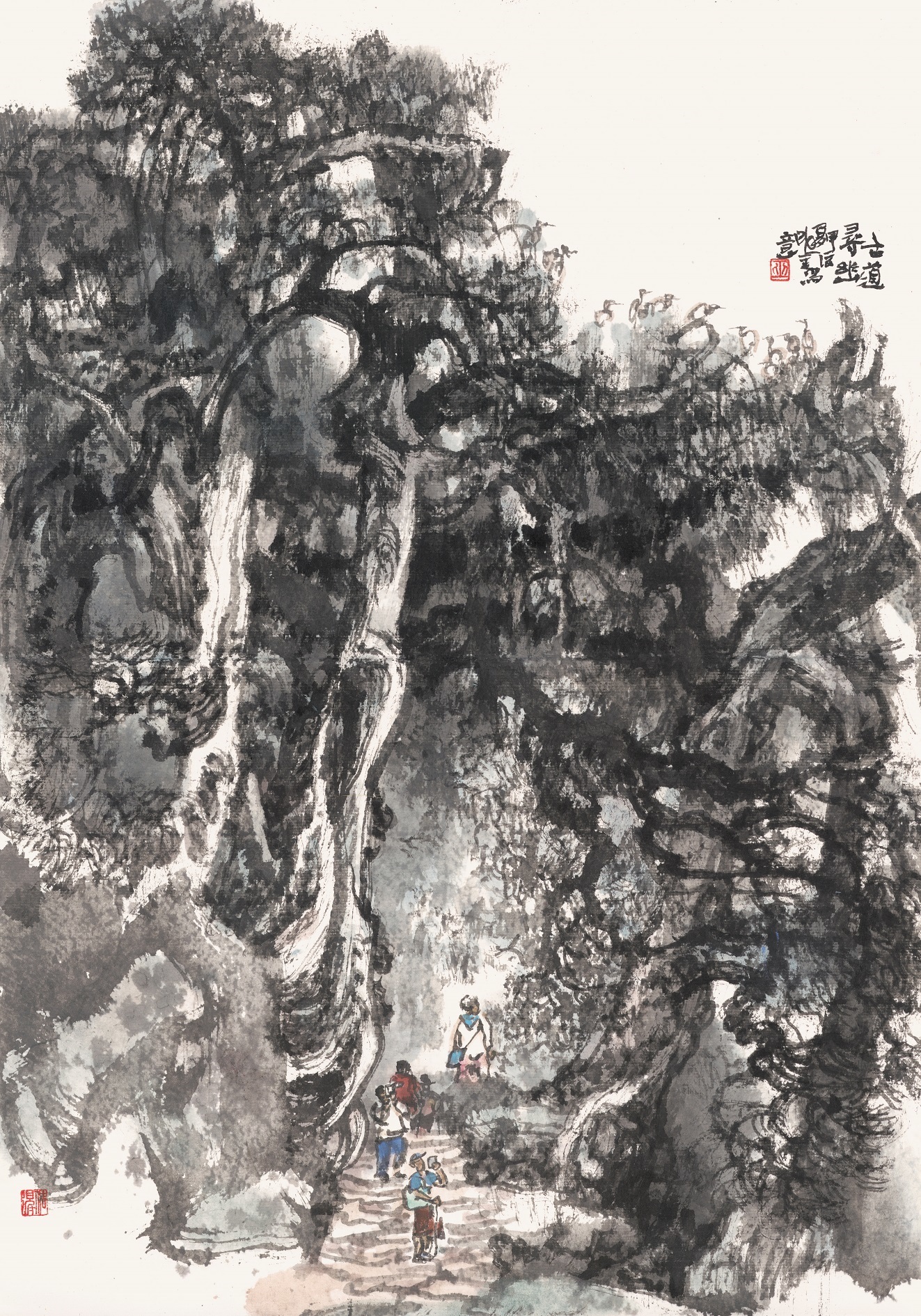 巫成金用传统中国画,演绎出翠云廊的厚重历史。在他古朴苍劲金刚铁骨般的笔法、浓烈酣畅沉雄厚重的墨法中,我们重见了汉风的古朴沉雄,唐人的浪漫豪迈,宋人的隽永清澈,明清的世俗清新,浓郁、神秘、浑厚、通透、浅吟、低唱、长啸、奔放,他的水墨呈现的翠云廊不是眼见的翠云廊,而是文化长河中的翠云廊。他的笔下不仅是在写景,还在倾述,在传颂,在述说着翠云廊远去历史的洪荒与静谧,鸣奏着华夏文明的远古洪钟。