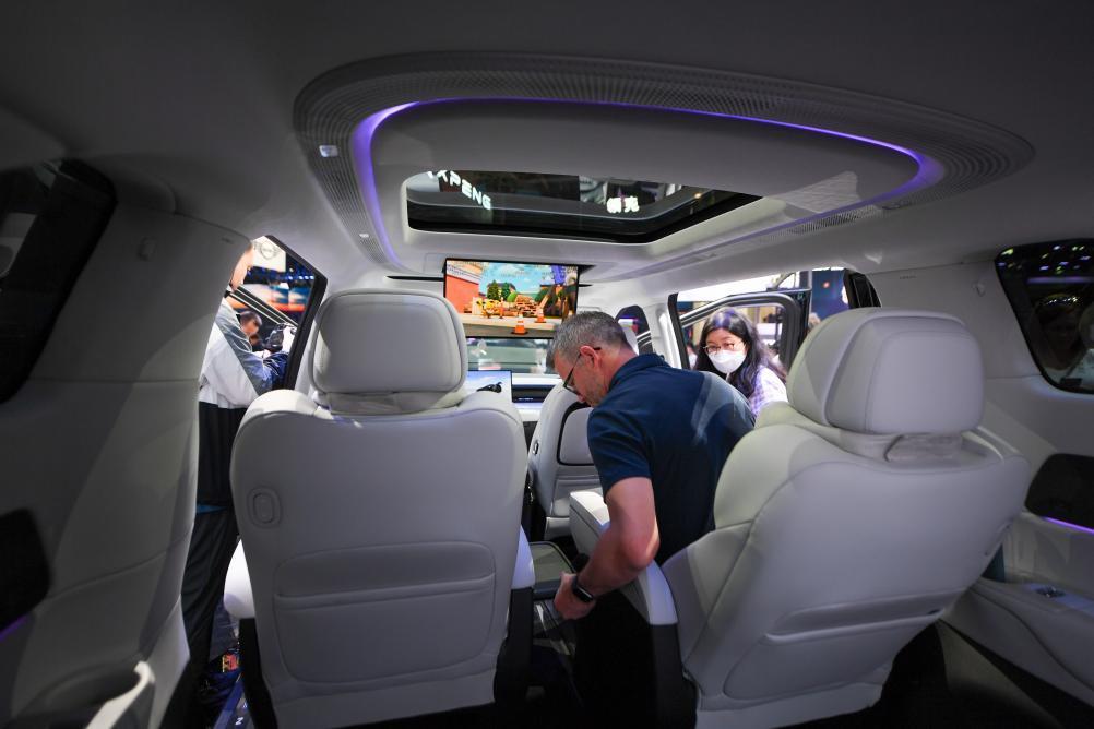 在北京中国国际展览中心顺义馆举行的2024北京车展上,参观者在小鹏汽车展区体验小鹏X9新能源汽车(2024年4月25日摄)。 新华社记者 鞠焕宗 摄