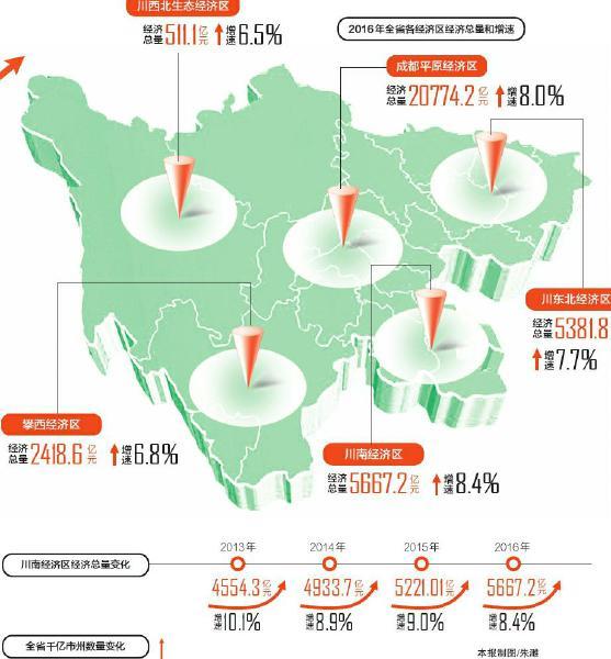 多点多极竞相发展凝聚成推动全省经济持续健康发展的强大合力。近几年,尽管国内外宏观经济下行压力持续加大,但四川经济始终保持了稳定增长的态势。地区生产总值2015年突破3万亿,2016年达到32680.5亿元,是2012年的1.4倍,在全国31个省市区中的排位从2012年的第8位提高到第6位。