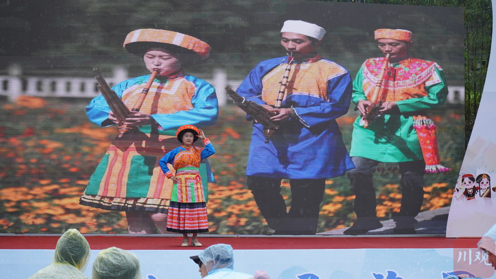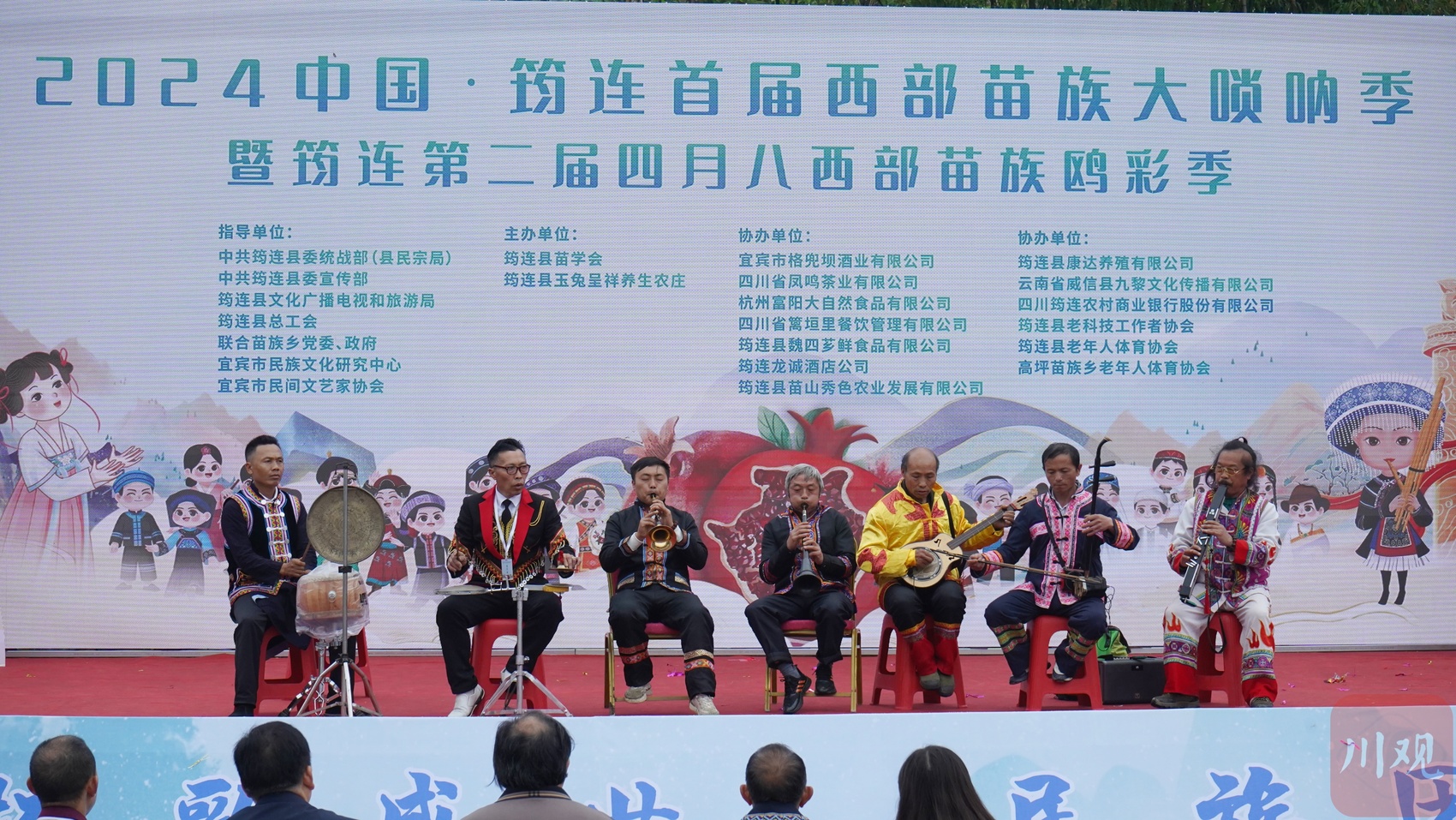 开幕式现场,芦笙阵阵、苗歌飞扬,热闹非凡,筠连苗家儿女身着盛装整齐排列在寨门两侧,为远道而来的客人吹起迎客号,端上苗家美酒,让游客们感受苗族同胞的热情好客。数名苗汉同胞手拉手跳起了芦笙舞,沉浸在一片欢乐的海洋里。