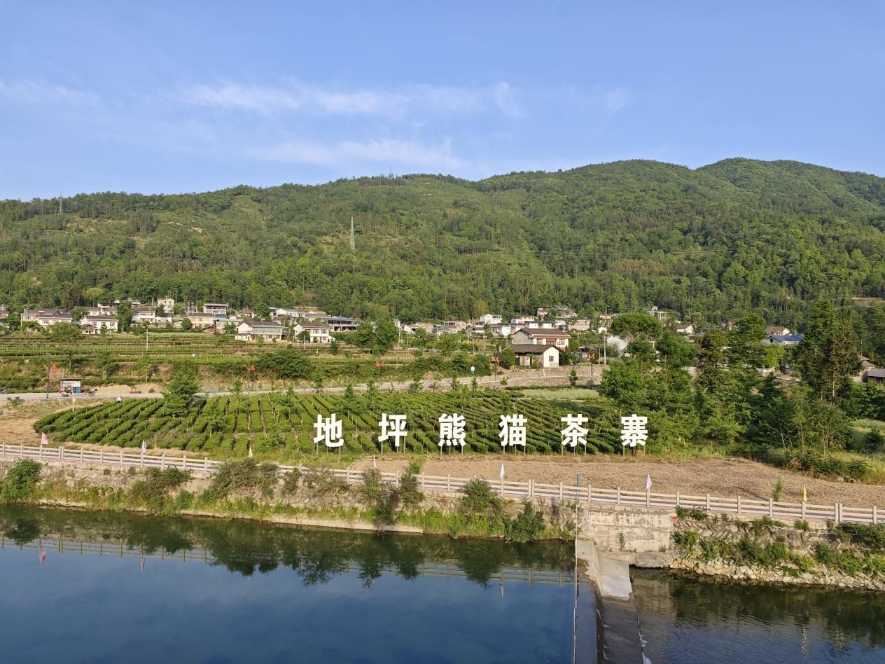 在地坪村地坪熊猫茶寨,平整的土地上楼房错落有致,一旁的溪流清澈见底。村落四周青山连绵、林木茂密。在这样山清水秀的环境滋养下,使得这里种出的茶品质优良。