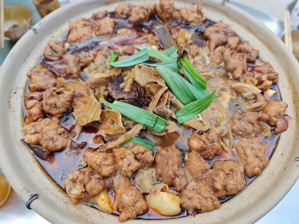 一旁的球场上,一群年轻人玩起了“斗鸡”。“听说这里的特色铜火锅很好吃,我们就专门从关庄镇过来尝尝。吃完饭发现村上还有玩耍的场地,很不错。”游客张地杰跟同伴说着,“这趟是来对了!”
