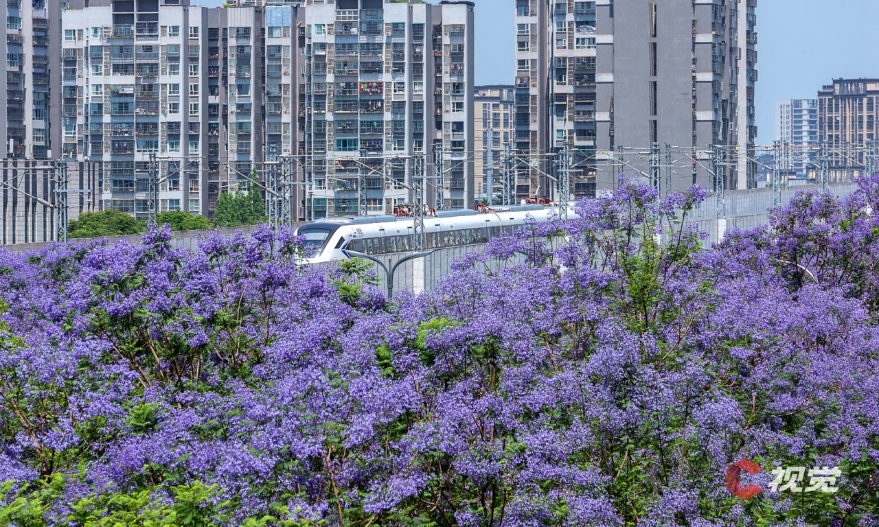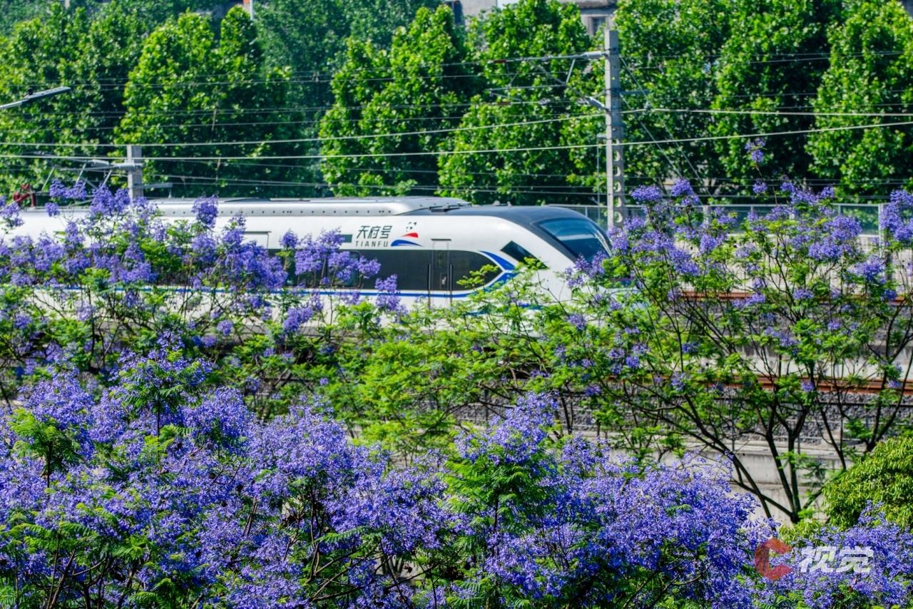 5月13日,成都武晋路,“天府号”动车驶过蓝花楹花海,飞机从蓝天划过,勾勒出一幅美好的夏日风景图。