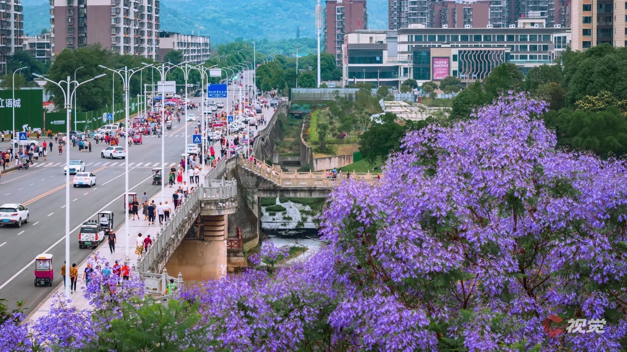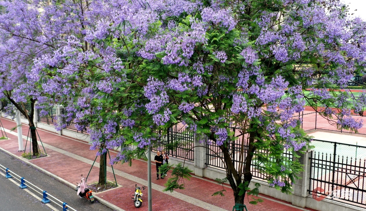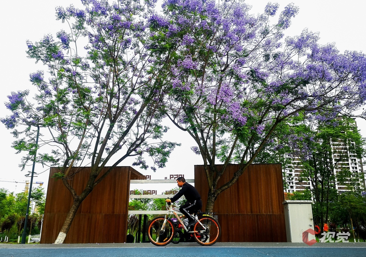5月14日,遂宁市主城区蓝花楹盛开,满树绚烂的紫色花朵,成为扮靓城市的最美风景线。