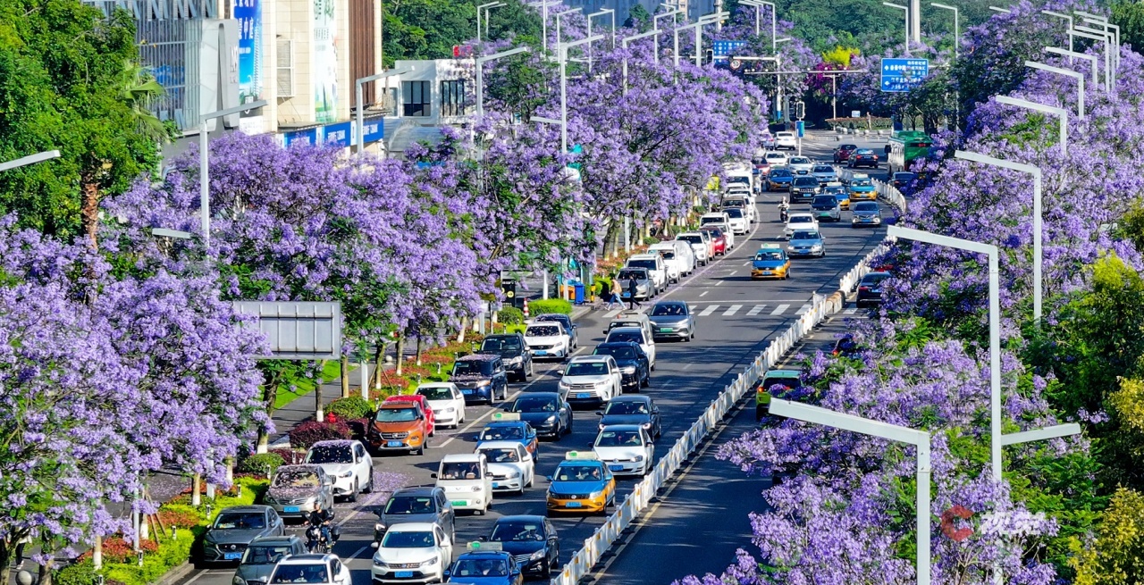 蓝楹盛开的季节,街头巷尾仿佛被紫色的云雾轻轻笼罩。高大的树冠上,一串串蓝紫色花朵如瀑布般垂挂,随风摇曳,宛如紫色的音符在空中跳跃。