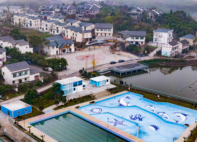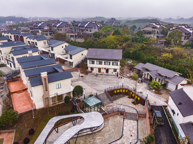 从内江城区驱车经内宜高速,不到15分钟的车程,在永安黄鹤湖收费站出站右走,大约行驶1公里,便是内江市市中区黄鹤湖国家AAAA级旅游景区的核心区尚腾新村。12月9日,穿过层层薄雾,从空中俯瞰,尚腾新村已悄然改变,一个崭新的“甜蜜小镇”已经呱呱坠地。