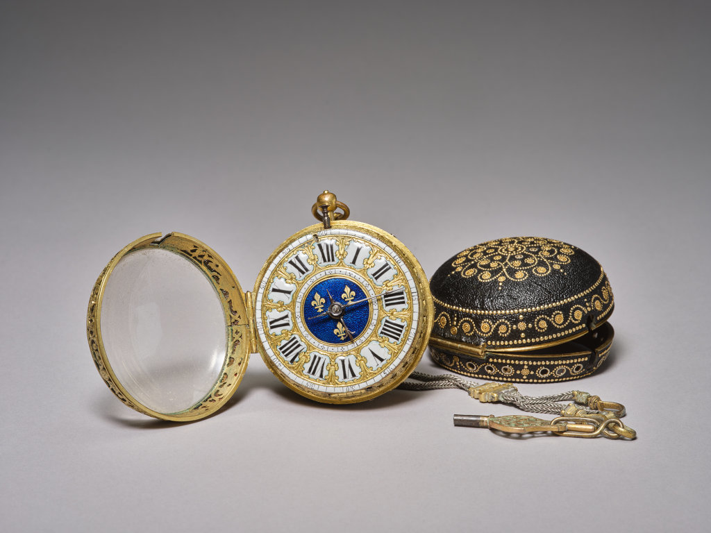 怀表最外层为黑鲨鱼皮表套,用金钉镶嵌出漩涡状和团花图案。铜镀金表壳中央,用郁金香花围出圆形开光,开光处是路易十四的头像。表盘中间蓝色珐琅上,绘有金色百合花图案。百合花是法国王室标志。打开机芯,可见摆轮保护罩上镂雕着一条中国式五爪金龙,这是中国皇帝的象征。机芯夹板上,还有制作工匠的名款和产地:法国宫廷御用钟表匠伊萨克·蒂雷制。