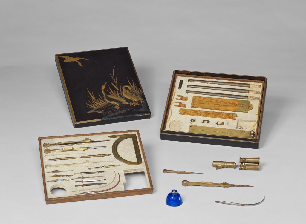 在聚光灯下,一只黑漆方盒,透着金属的光泽,温润雅致。方盒里,放置着30多件大大小小、长长短短的仪器,其中包括比例尺、直尺、矩尺、圆规、测角尺等。盒内还有铜镀金三角支架和蓝色珐琅水丞,同“国王的数学家”从法国带来的仪器不同的是,水丞底部镌刻“康熙御制”款。原来,这盒绘图仪器,是康熙时期清宫造办处将法国制和清宫自制仪器配套组合而成的“全家福”。这样的仪器,在清宫为数不少,铜量角器、铜镀金比例规尺等,功能齐备,非常实用,催生了近代以来中国科学精神的萌芽。