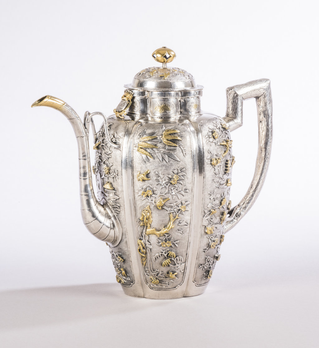 其中一件中式银镀金壶,是凡尔赛宫收藏的珍品、暹罗使团带到法国的礼物。银质錾刻的技艺恍若天工,镀金高浮雕的人物、鸟兽、花卉与宝塔图案栩栩如生。银壶底部,刻有法国王室盾形纹章和三皇冠标记。此后,在宫廷政变和法国大革命期间,国王和政府曾先后下令熔化金银器,但这件文物两次幸免于难,成为暹罗使团所赠礼物中唯一保存下来的金银器。