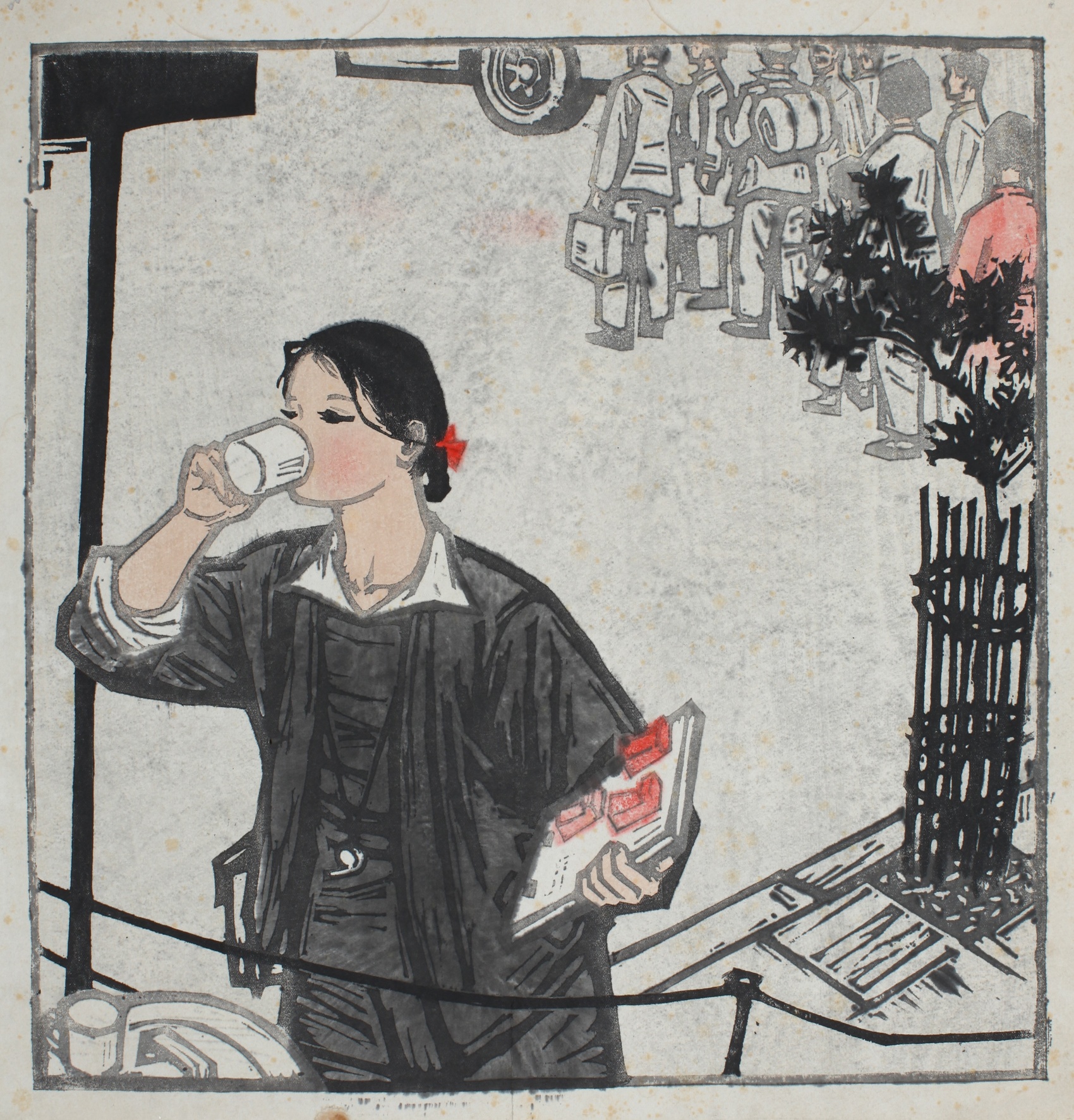 一些艺术大家的早期作品,也得以罕见地出现在本次展览中,著名当代艺术家徐冰的黑白木刻《打稻子的姑娘们》就是一例。1978年至1983年,青年徐冰创作了100多幅木刻小品,统称《碎玉集》。其中,1981年创作的《打稻子的姑娘们》表现农村生活劳作场景,但形式上已和国内此前的版画创作有了明显的差异,更突出版画语言的形式美,强调色块内的点、线组合,使整个画面有一种内在的张力,富有律动感。