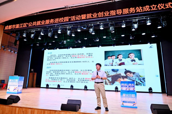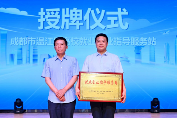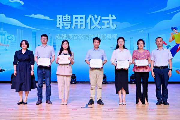 成都市就业局就业服务处处长何彬为成都师范学院就业创业指导服务站授牌。区人社局党组成员、就业局局长岳忠,成都师范学院招生就业处副处长魏翔宇为就业创业指导师代表颁发聘书。