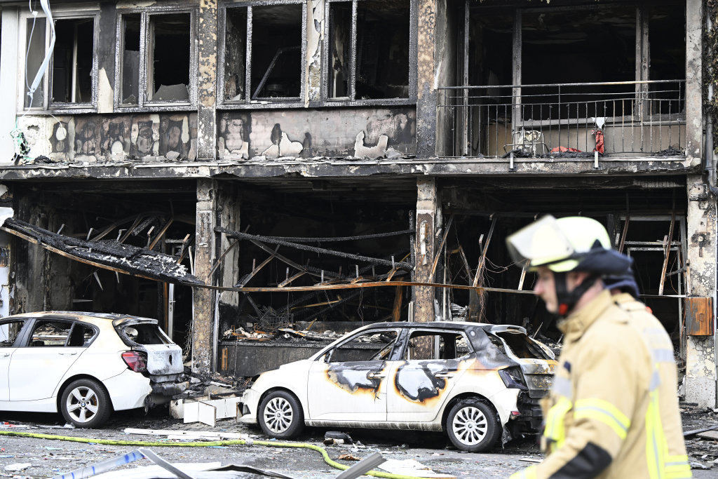 5月16日,消防员走过德国杜塞尔多夫发生火灾的建筑。