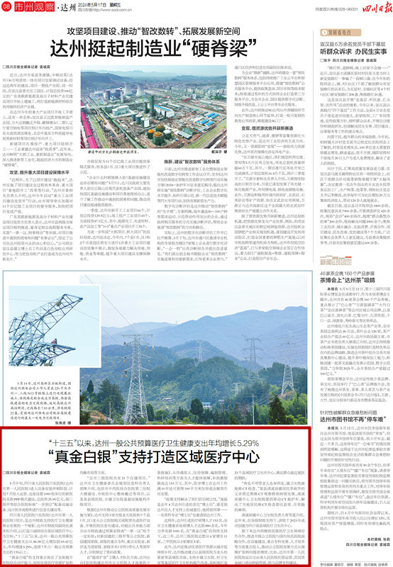四川省人民医院川东医院(达州市第一人民医院)项目,是达州财政支持医疗卫生健康事业发展的一个缩影。达州市财政局副局长黄本松介绍,以打造川渝陕结合部区域医疗中心为目标,“十三五”以来,达州一般公共预算医疗卫生健康支出从48.38亿元增加到69.42亿元,年均增速5.29%,连续7年占一般公共预算支出的13%以上。