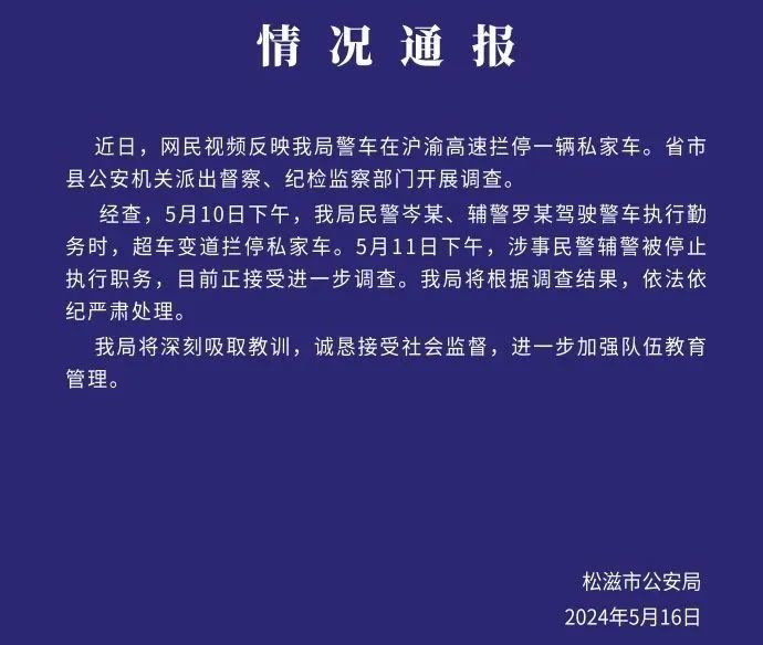 近日,网民视频反映我警车在沪渝高速拦停一辆私家车。省市县公安机关派出督察、纪检监察部门开展调查。经查,5月10日下午,我局民警岑某、辅警罗某驾驶警车执行勤务时,超车变道拦停私家车。5月11日下午,涉事民警辅警被停止执行职务,目前正接受进一步调查。