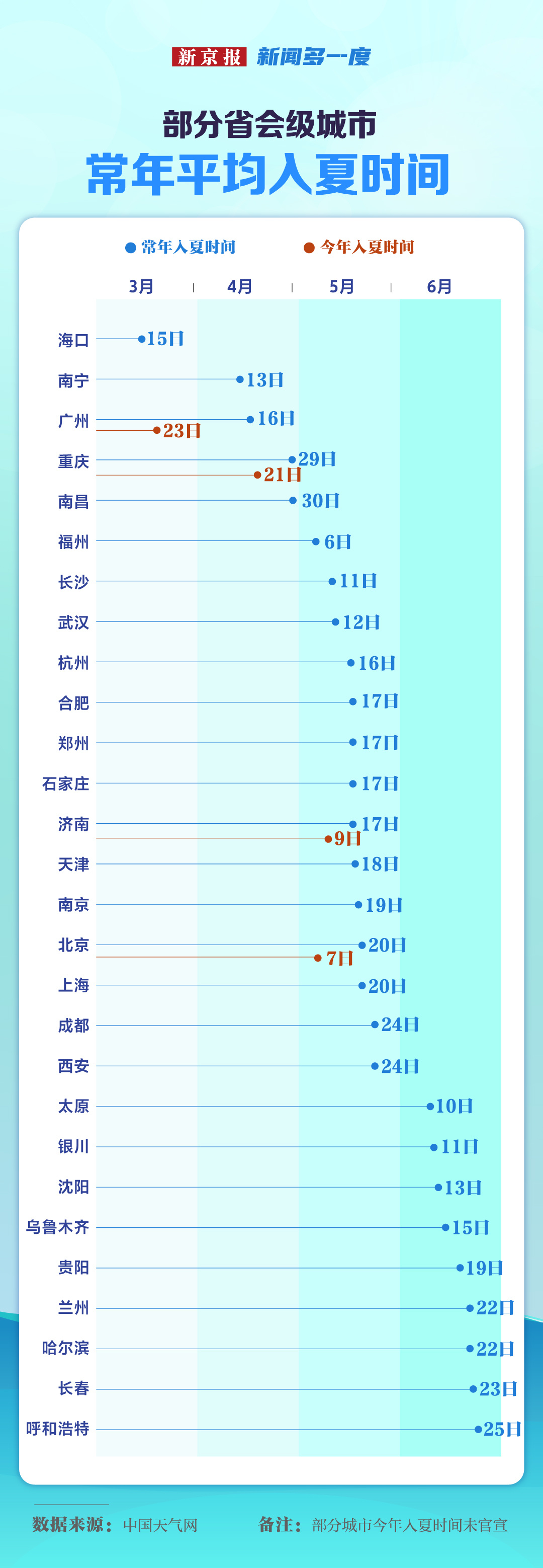 今年不止北京提早入夏了,根据公开报道,不少地方已经提前入夏。例如广州于3月23日正式入夏,较往年入夏时间提早24天;济南于5月9日官宣入夏,较往年提早8天。不止今年,中国天气网根据大数据统计发现,近五十多年我国的夏季来得越来越早。每年的具体入夏日期都会受到多种因素的影响,如当年的气候特点、冷暖空气的交锋等。