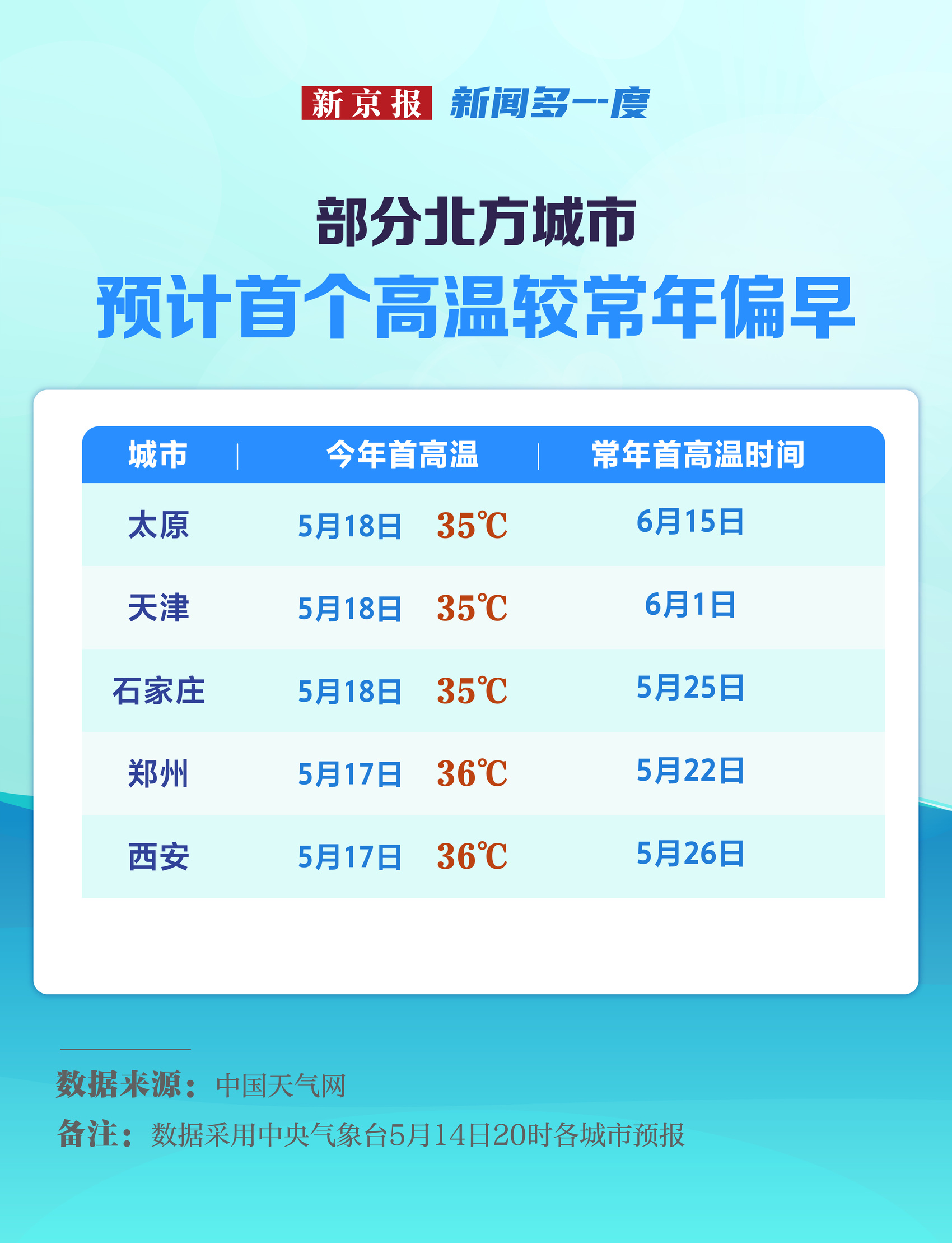 据中央气象台预报,5月17日至19日,南疆盆地、华北平原、黄淮等地的部分地区将有35℃以上高温,局地气温甚至可超37℃。省会级城市中,西安、郑州、济南都有望迎来今年来首个高温天气,普遍早于常年,其中西安、郑州将遭遇高温“两连击”。