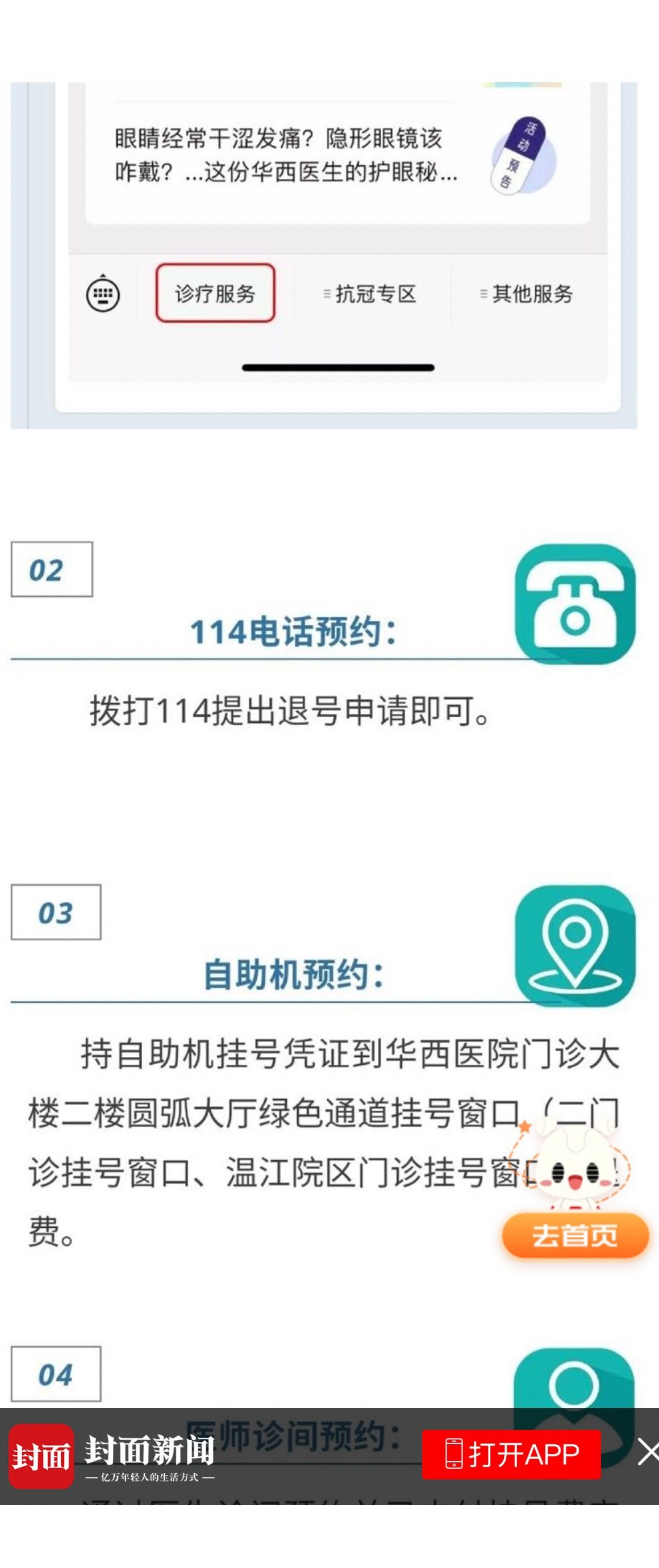 9日下午,记者从四川大学华西医院了解到,因疫情防控原因,华西医院于本周内(12月13日前)临时调整预约挂号的退号时间,由之前的须提前两天退号,调整为可提前一天退号,如本周因疫情不能来华西医院的已预约挂号患者,可提前一天按以下方式退号,明天开始实行,也就是说明天可退后天的号。
