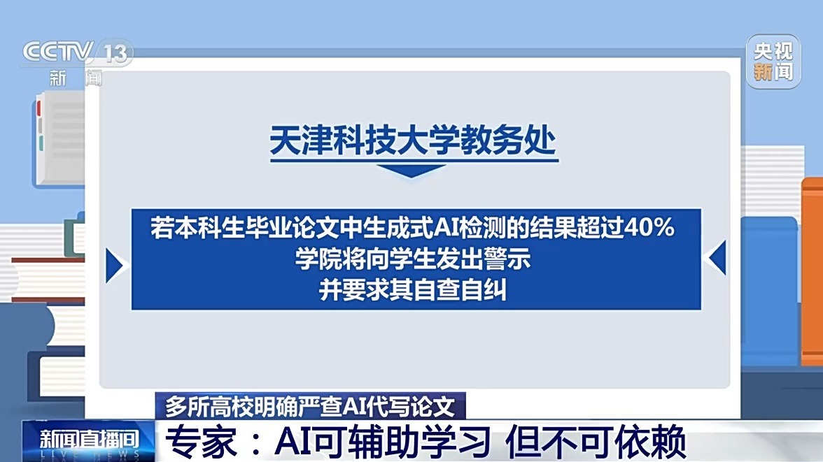北京教育科学研究院高等教育科学研究所所长 高兵:除了防止学生代写的一些政策文件以外,学校应该明确学生在使用AI时,主动地介绍你的AI使用情况,比如说哪些部分,或者是哪些方法上你使用了AI,来确保我们任务或者是研究内容的原创性和真实性,同时也能够遵守学术诚信的原则。