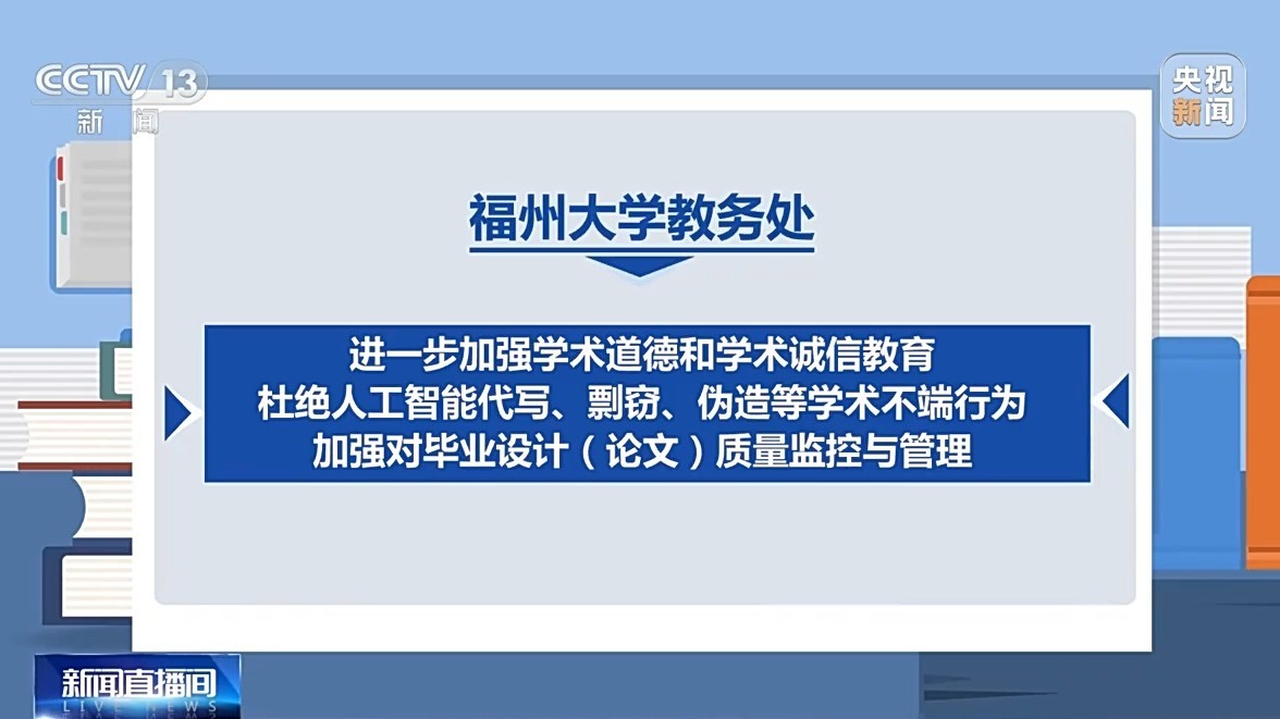 福州大学教务处在今年下发的通知中明确,引入AI代写查询,是为了“进一步加强学术道德和学术诚信教育,杜绝人工智能代写、剽窃、伪造等学术不端行为,加强对毕业设计(论文)质量监控与管理”。