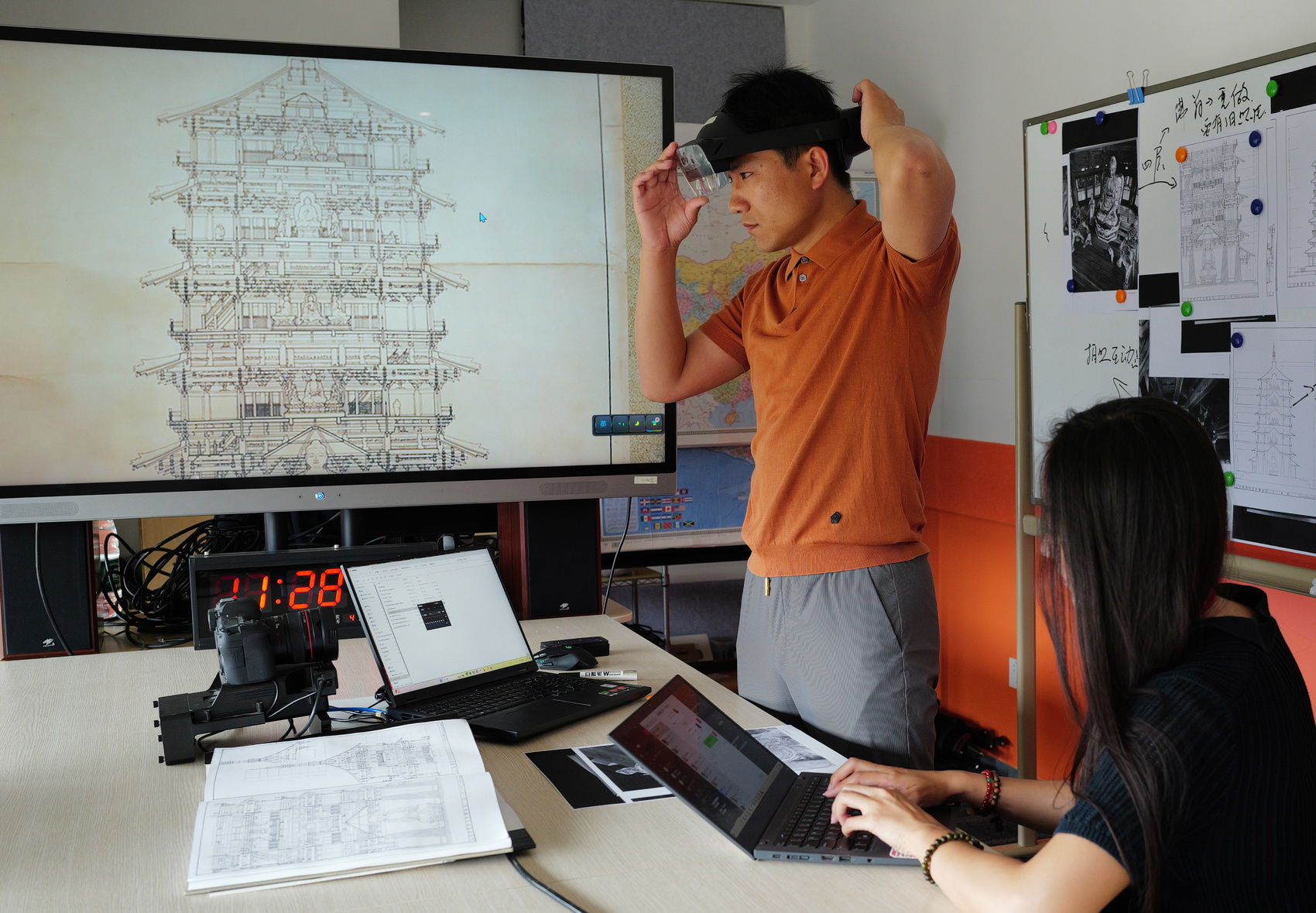 5月9日,AIGC智慧应县木塔北京实验室内,邢春齐(左)和项目负责人郭俐杉(右)正在对智慧木塔新一代VR设备进行调试。