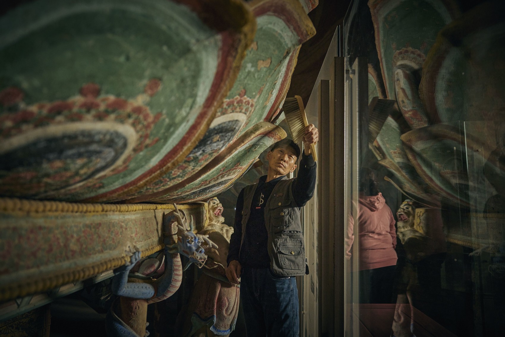 4月25日,工作人员正在清理应县木塔内雕塑上的灰尘。
