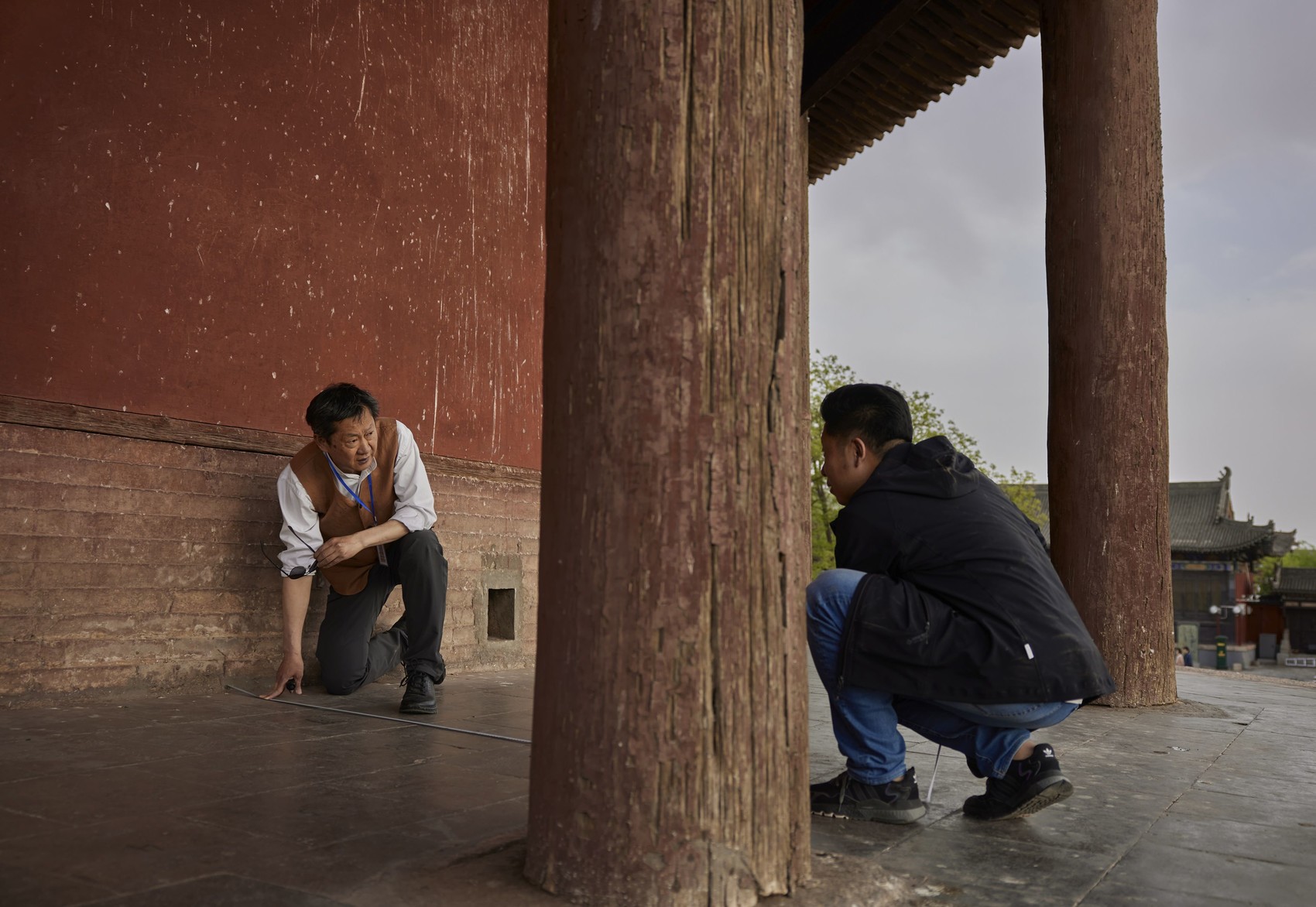 4月25日,刘畅(左)与山西省古建筑与彩塑壁画保护研究院副院长王小龙(右)一同测量塔基尺寸,讨论古建筑历史变化的细节。
