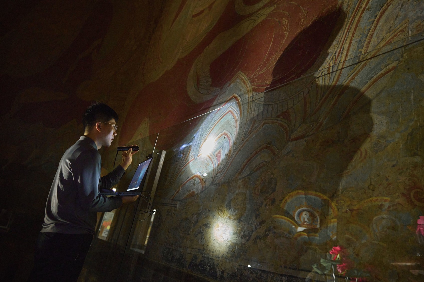 4月25日,AIGC智慧木塔技术负责人邢春齐在木塔一层仔细观察壁画的细节。