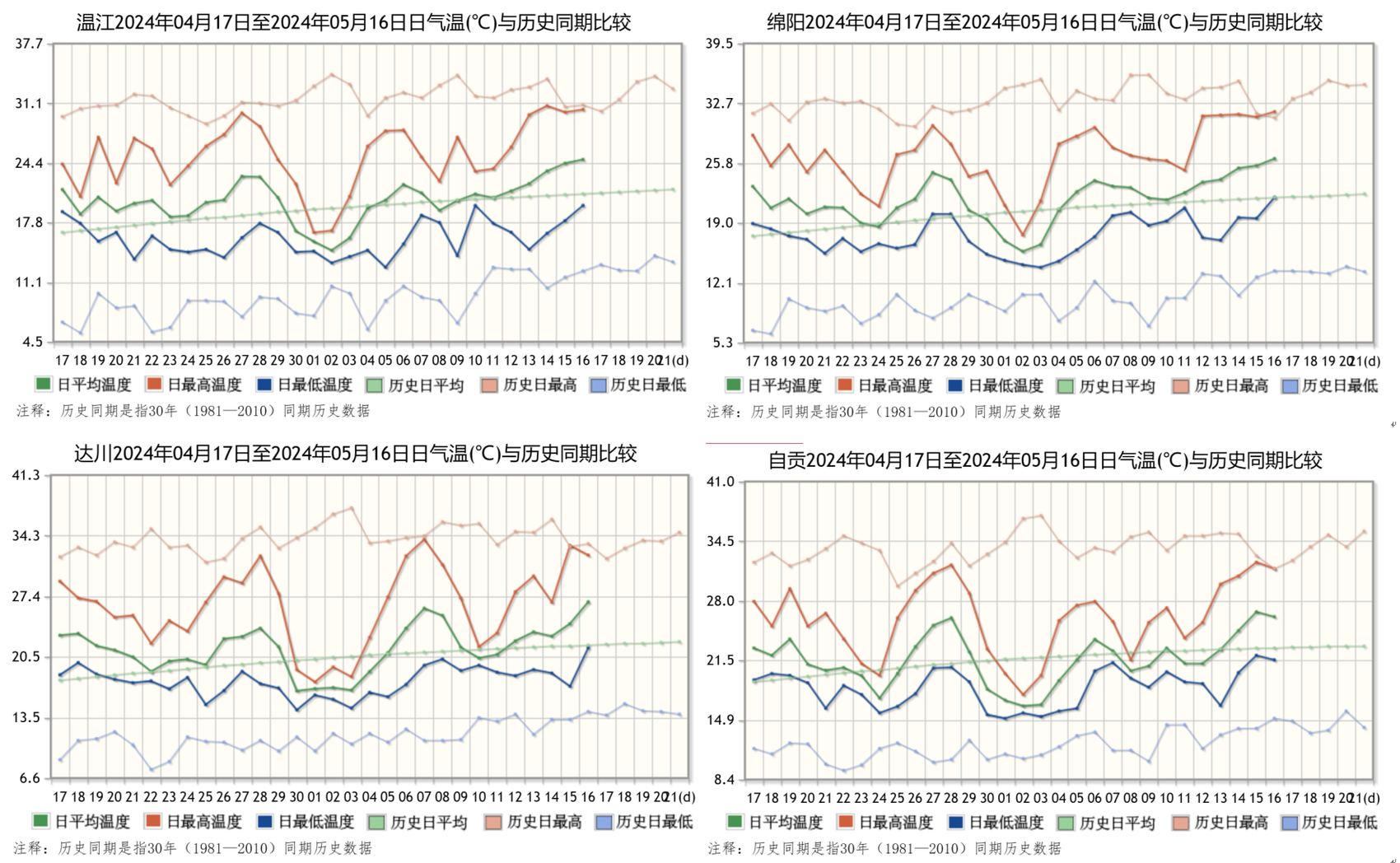 从上图,可以得出大概结论:与常年同期相比,本周四川盆地气温一直偏高,但日最高气温还未突破历史最大值。