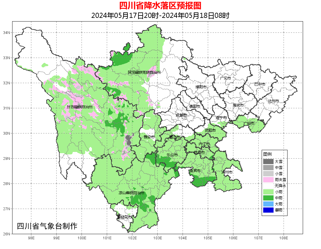 今天晚上,盆地大部多云,其中广安、资阳、内江、自贡、雅安、乐山、宜宾、泸州8市多云间阴有阵雨或雷雨,局部中雨;甘孜州大部、阿坝州西部和凉山州大部阴天间多云有阵雨(雪)或雷雨,其中甘孜州东部、阿坝州西北部及凉山州中部有中雨,攀枝花市多云。