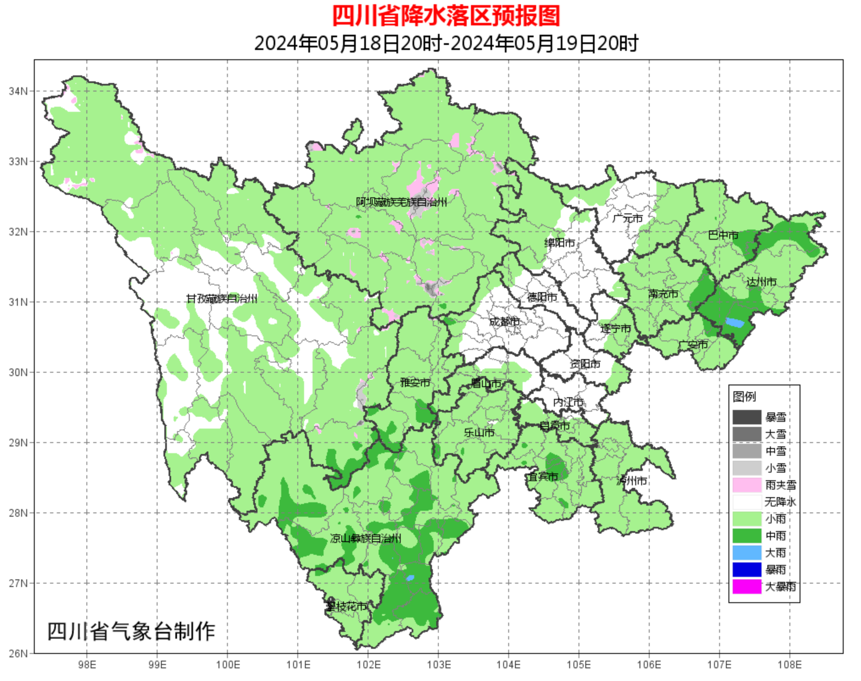 18日晚上到19日白天,盆地大部阵雨转多云,其中达州有中雨,个别大雨;川西高原和攀西地区多云间阴有阵雨(雪)或雷雨,其中攀西地区部分地方有中雨。
