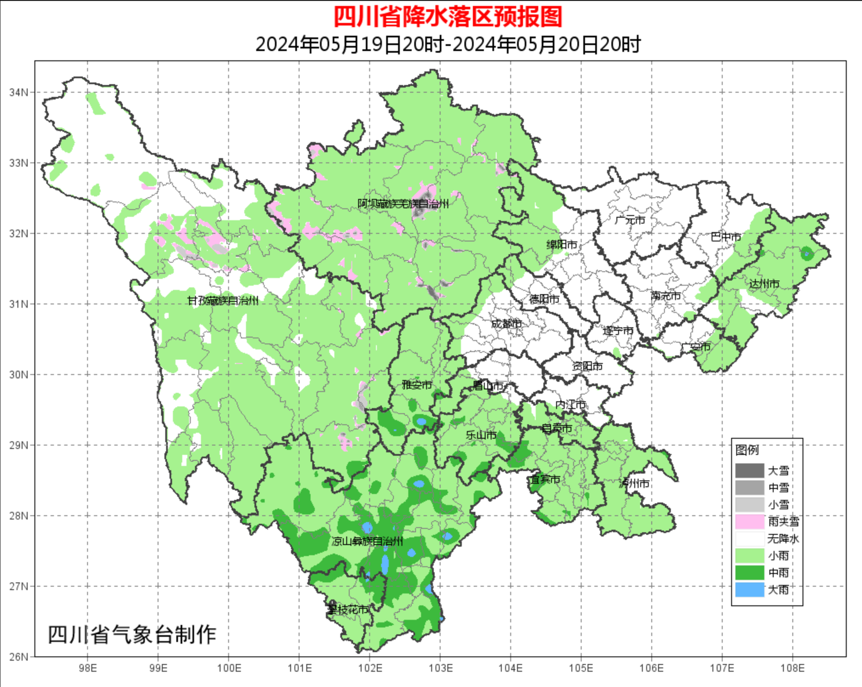 19日晚上到20日白天,盆地大部多云间阴,其中达州、广安、雅安、乐山、自贡、宜宾、泸州7市及西部沿山有阵雨或雷雨,局部中雨;川西高原和攀西地区多云间阴有阵雨(雪)或雷雨,其中攀西地区有中到大雨。