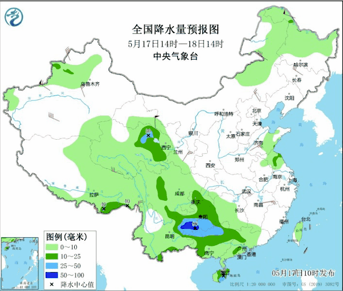 对于四川这一轮降水天气过程,中央气象台有如下提示:过去10天(5月7日-16日),四川盆地南部等地累计降水量有40—70毫米,降水较常年同期偏多5—8成。预计5月17日14时至18日08时,山东南部、四川南部、贵州东部和西南部、云南东部和西南部、广西中西部、海南岛等地的部分地区将有短时强降水天气,小时雨量20—40毫米,局地可达50毫米以上。