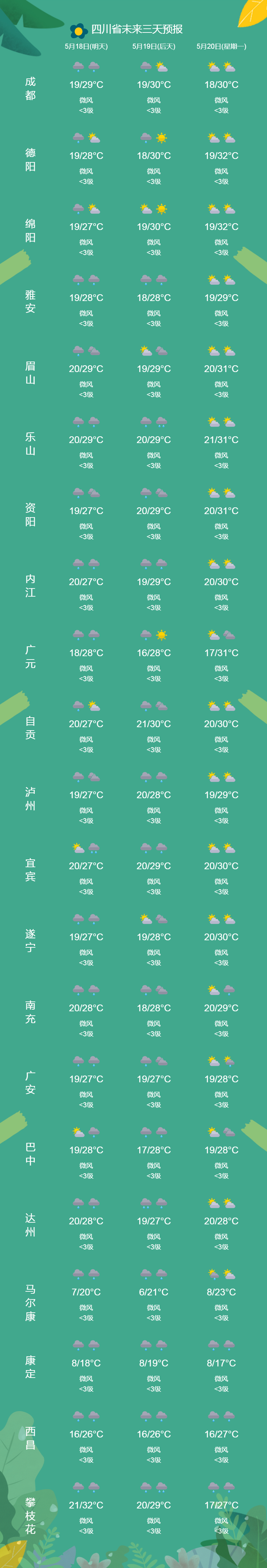 四川省气象台今天16时发布最新天气预报:未来三天,盆地大部地方有阵雨或雷雨,西南部、南部局部有中雨;川西高原和攀西地区阴天间多云有阵雨(雪)或雷雨,局部中到大雨。